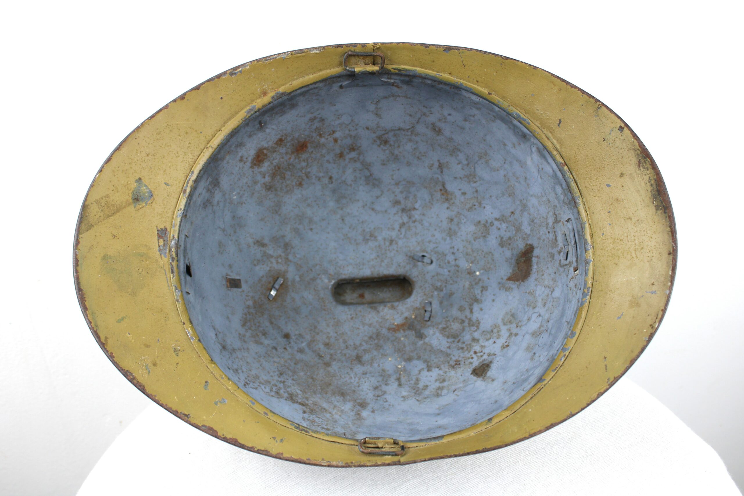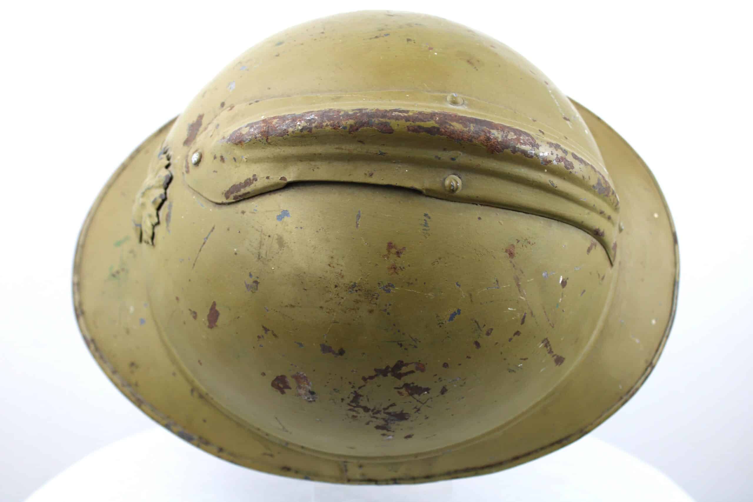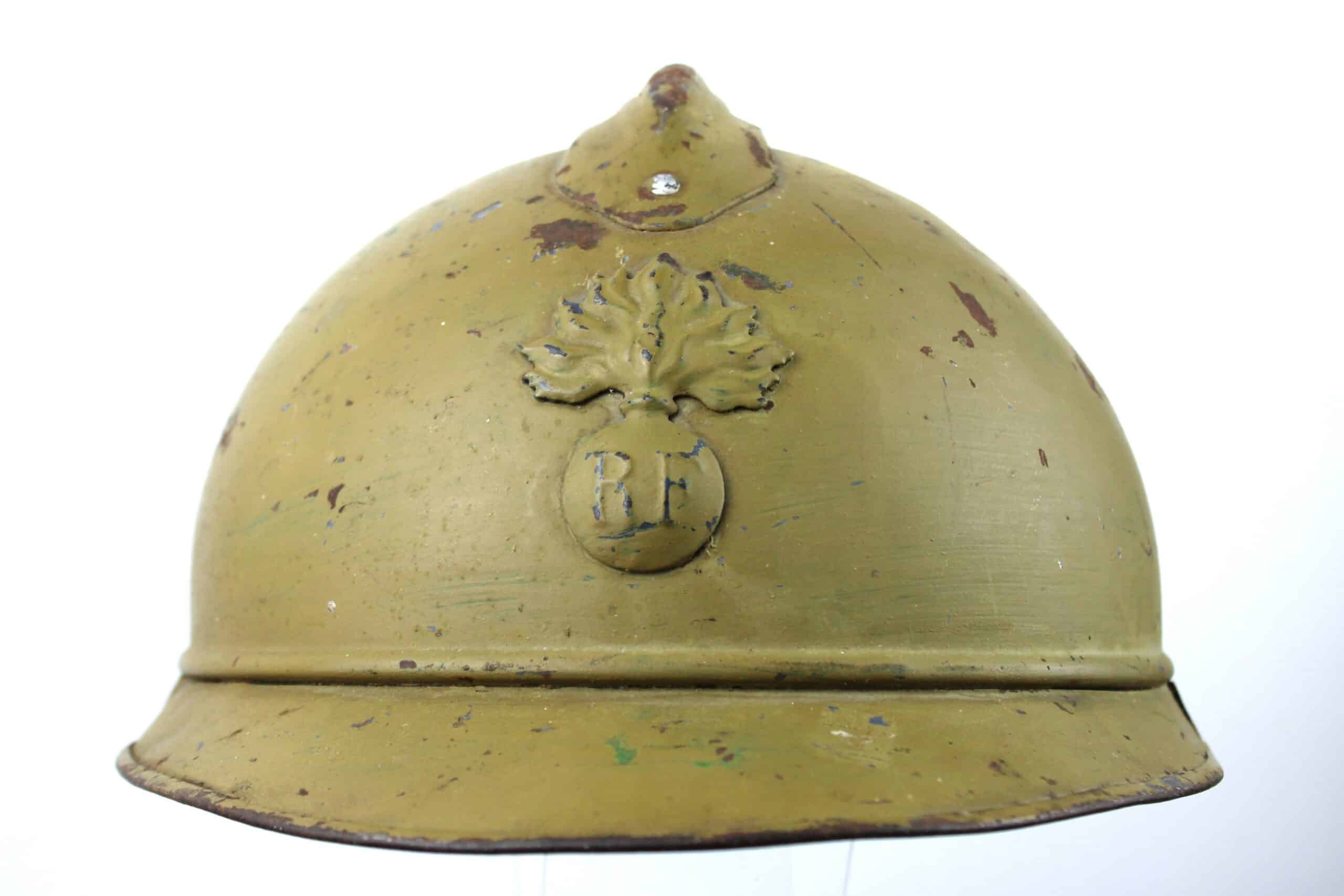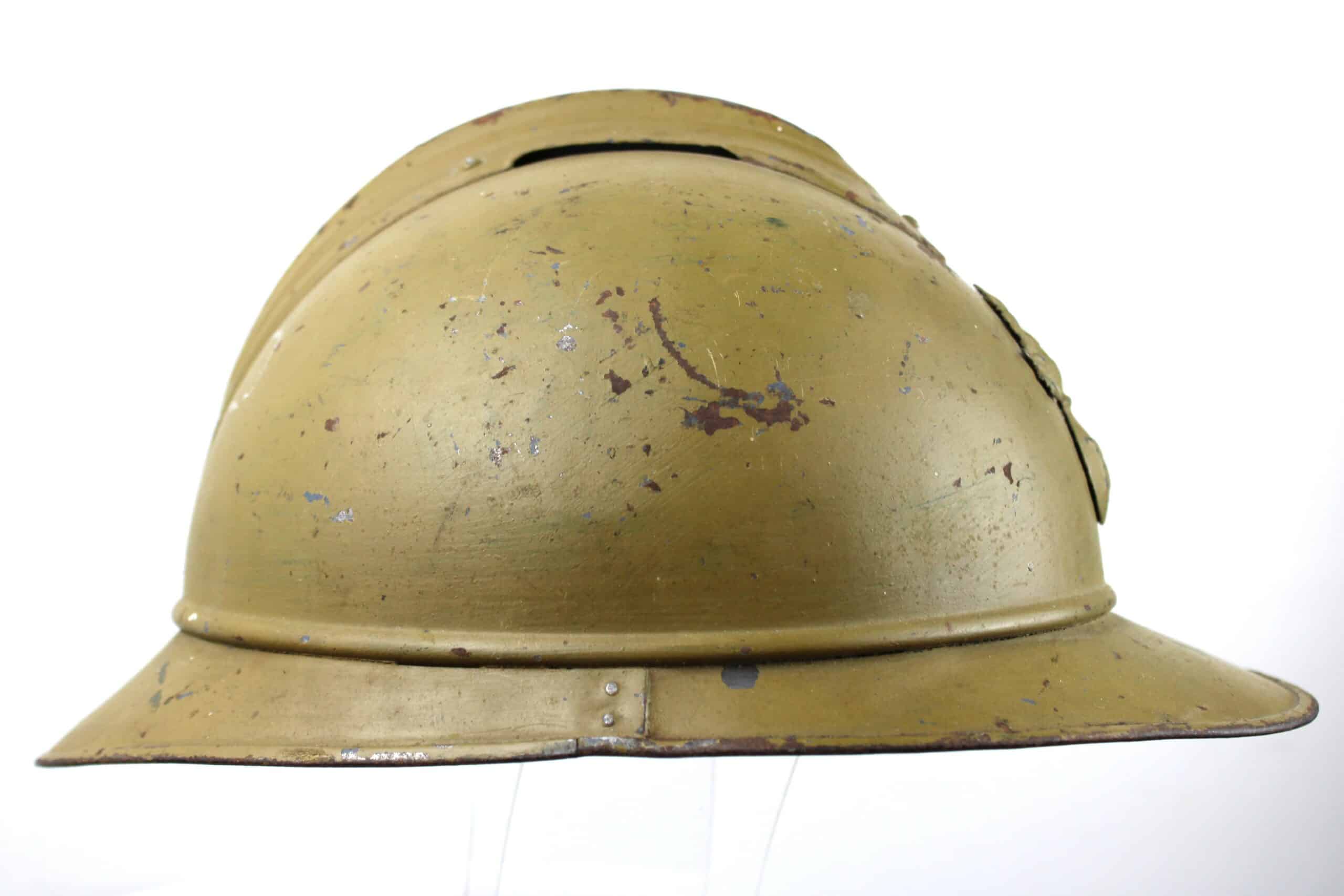 Très intéressante coque de casque Adrian Modèle 15 de la 1er guerre Mondiale dans un jus incroyable, insigne infanterie modèle 15 et peinture de camouflage moutarde encore très présente sur l’ensemble du casque.