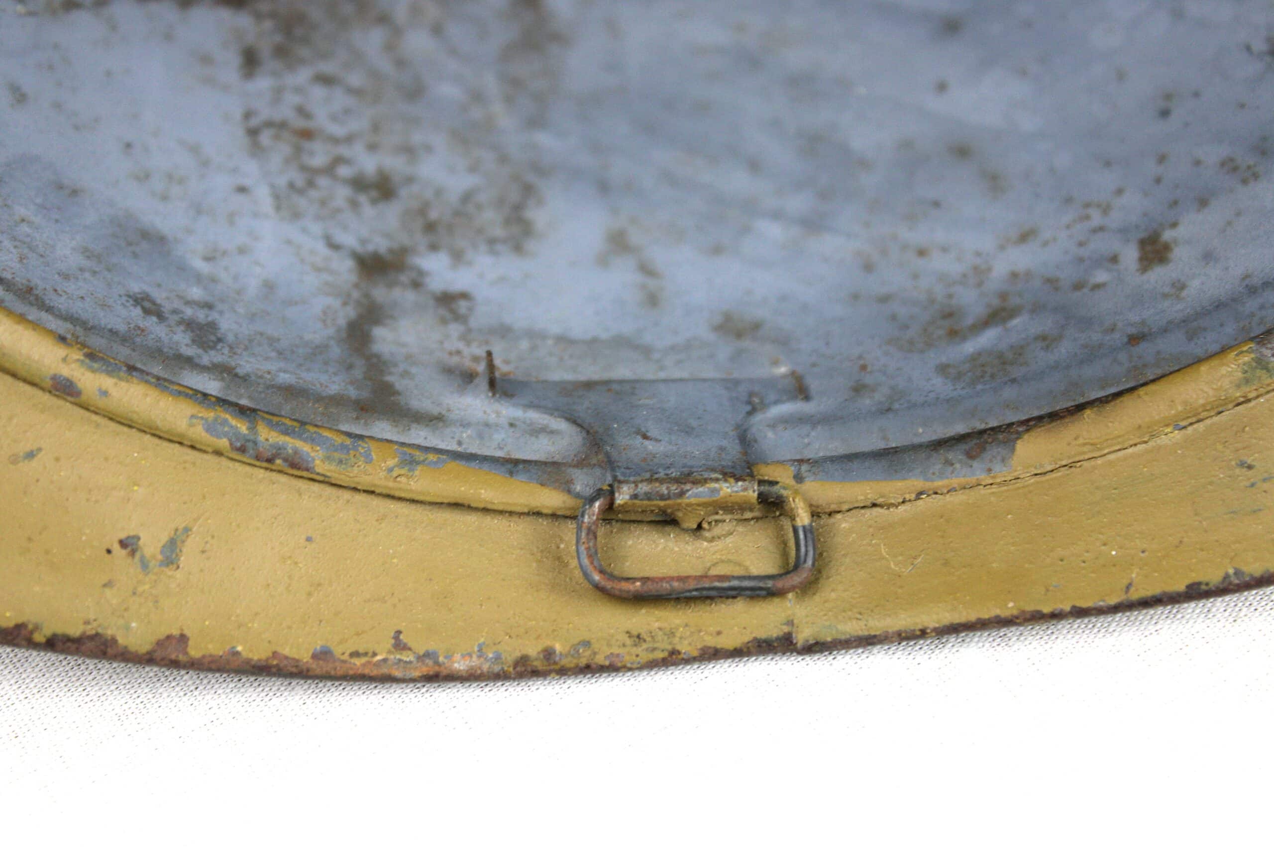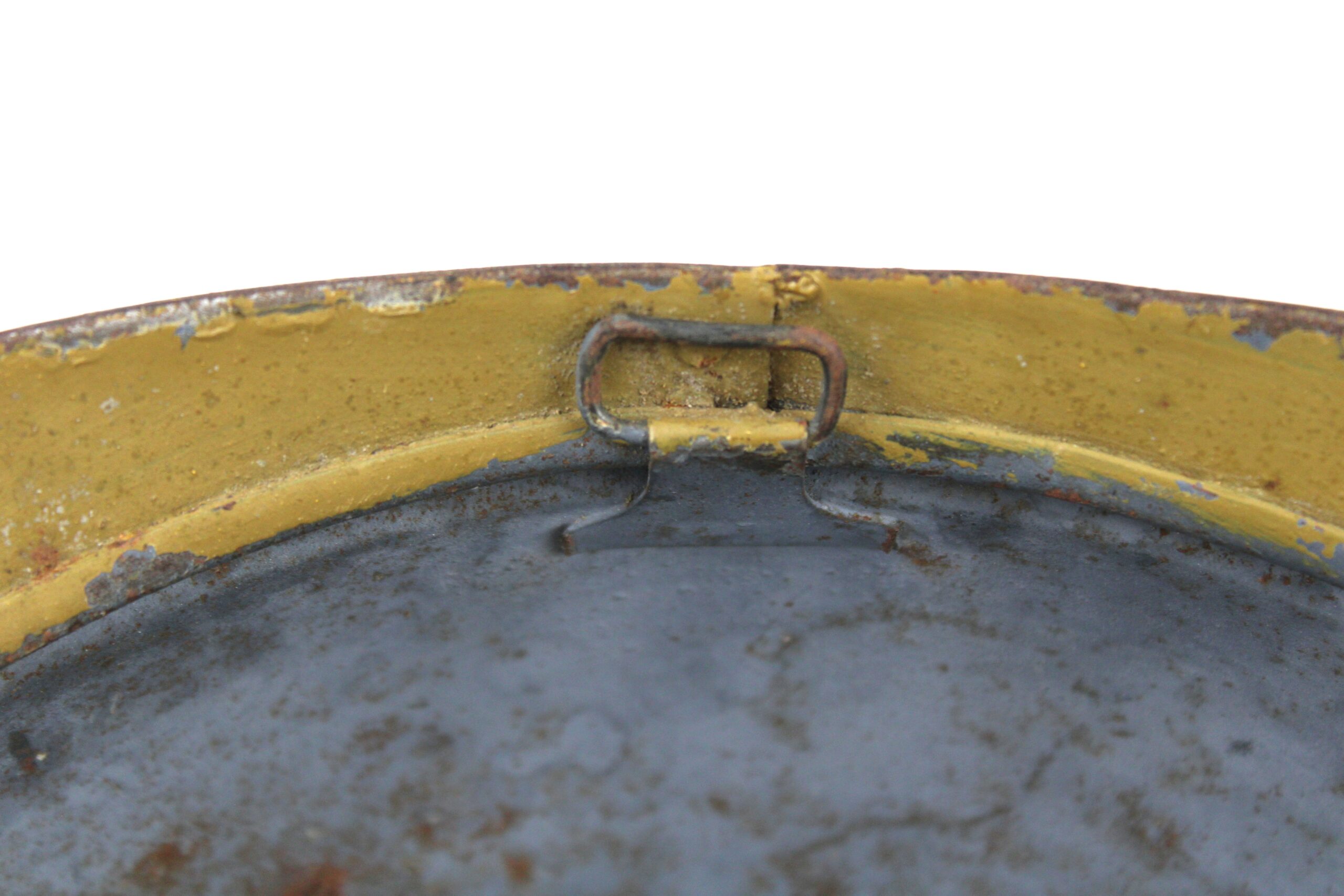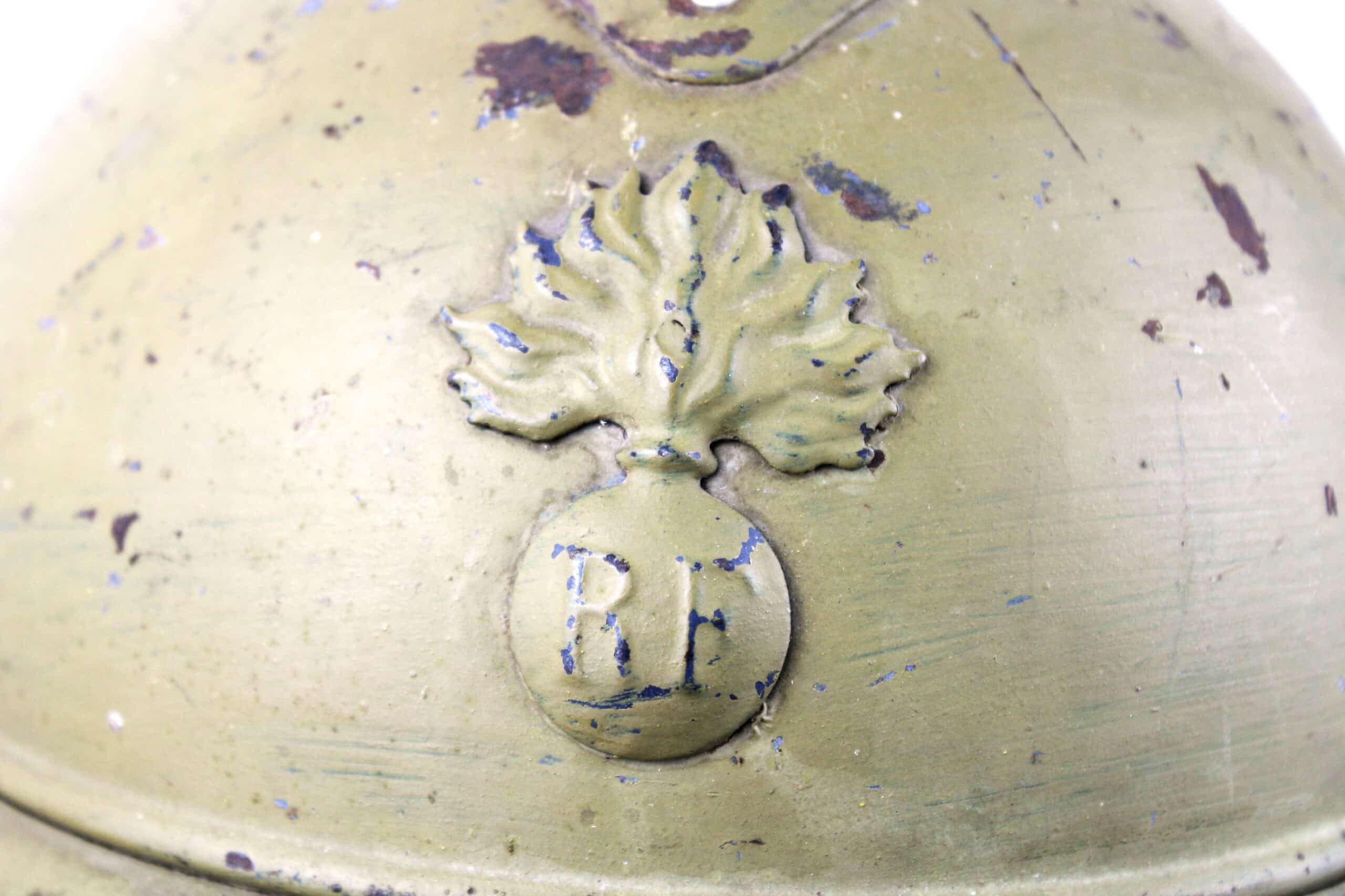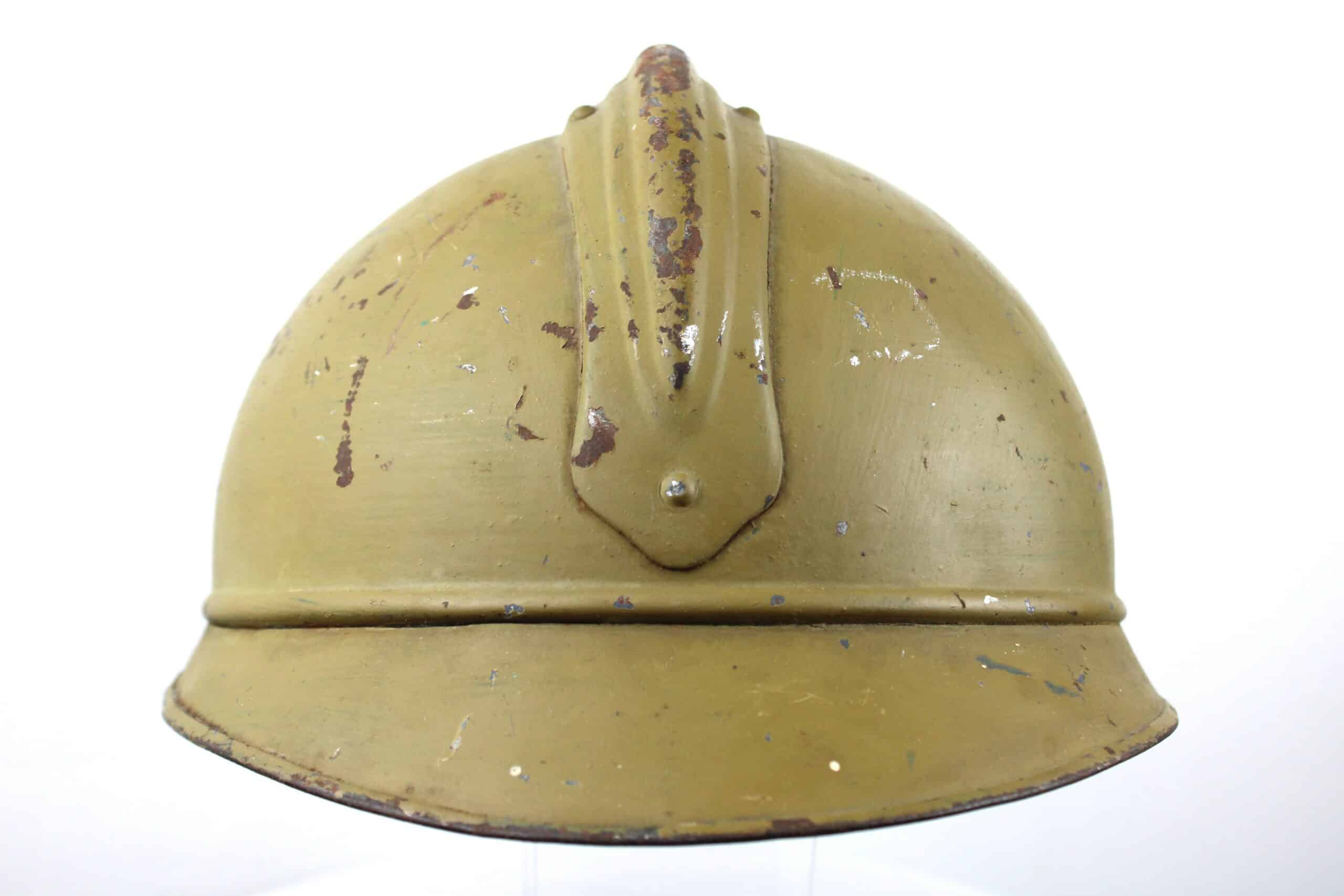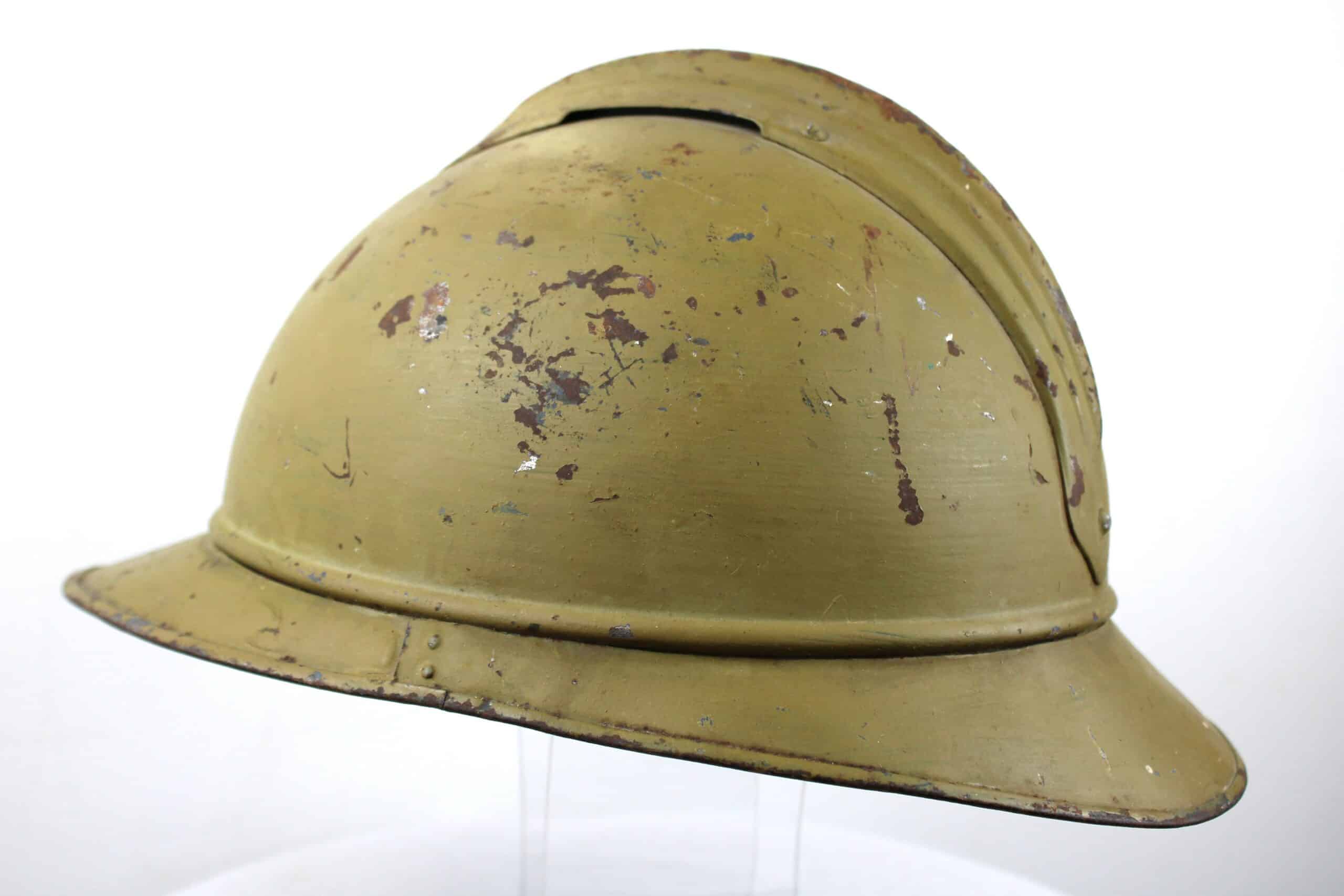 Très intéressante coque de casque Adrian Modèle 15 de la 1er guerre Mondiale dans un jus incroyable, insigne infanterie modèle 15 et peinture de camouflage moutarde encore très présente sur l’ensemble du casque.