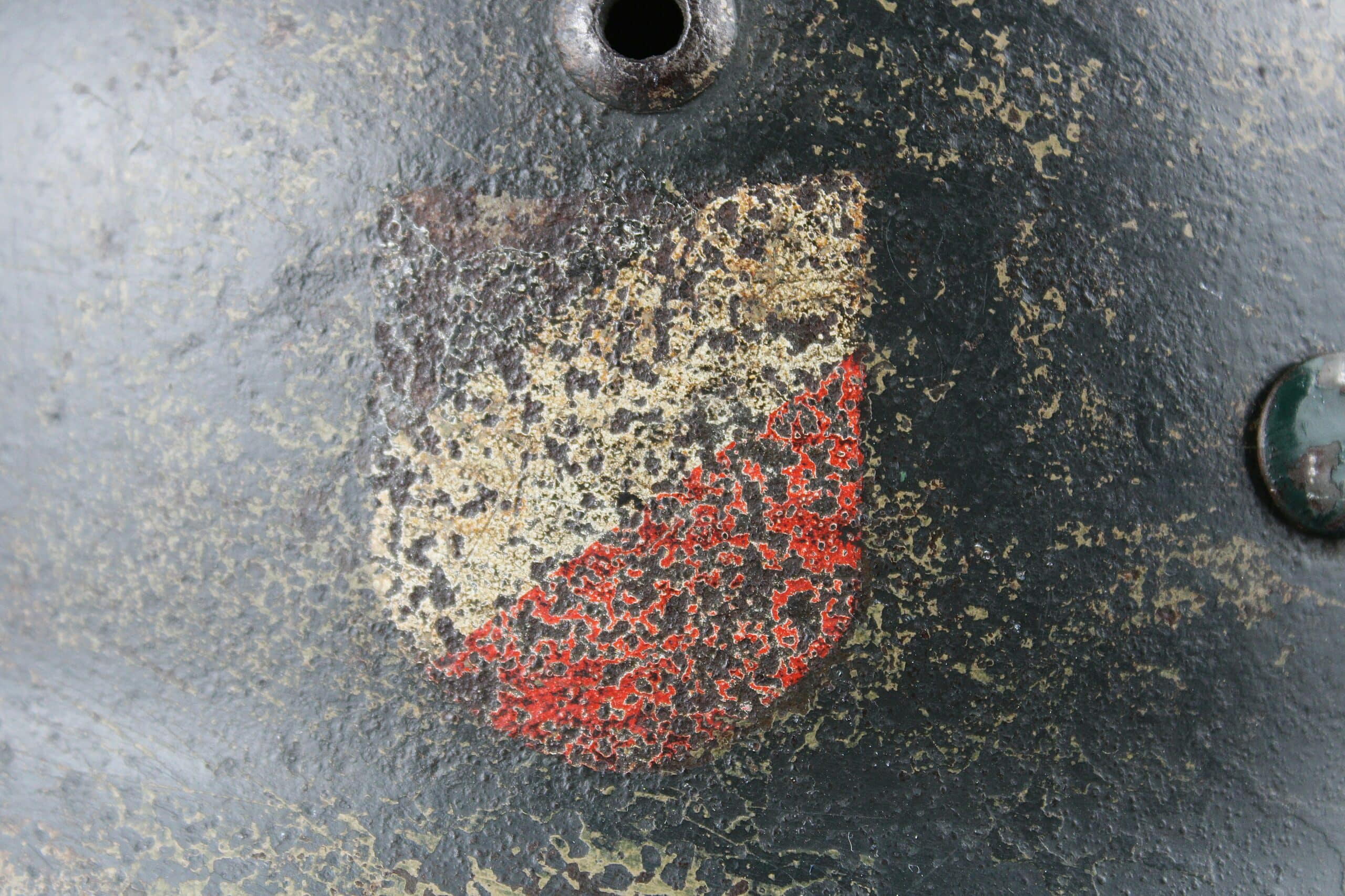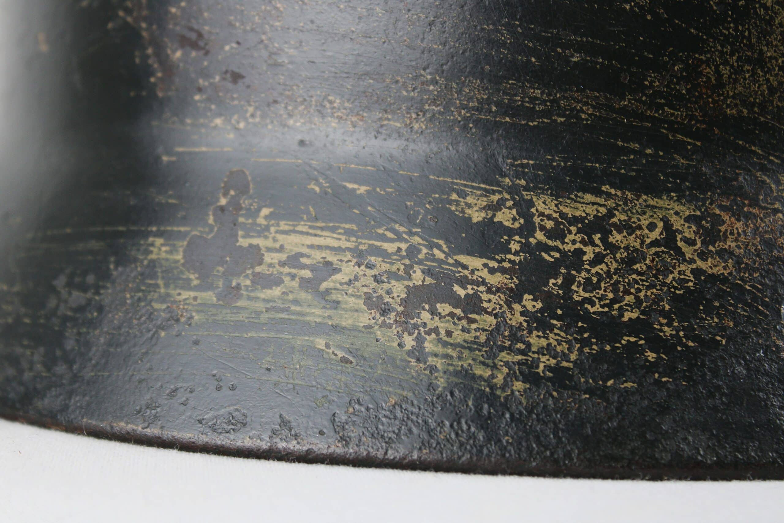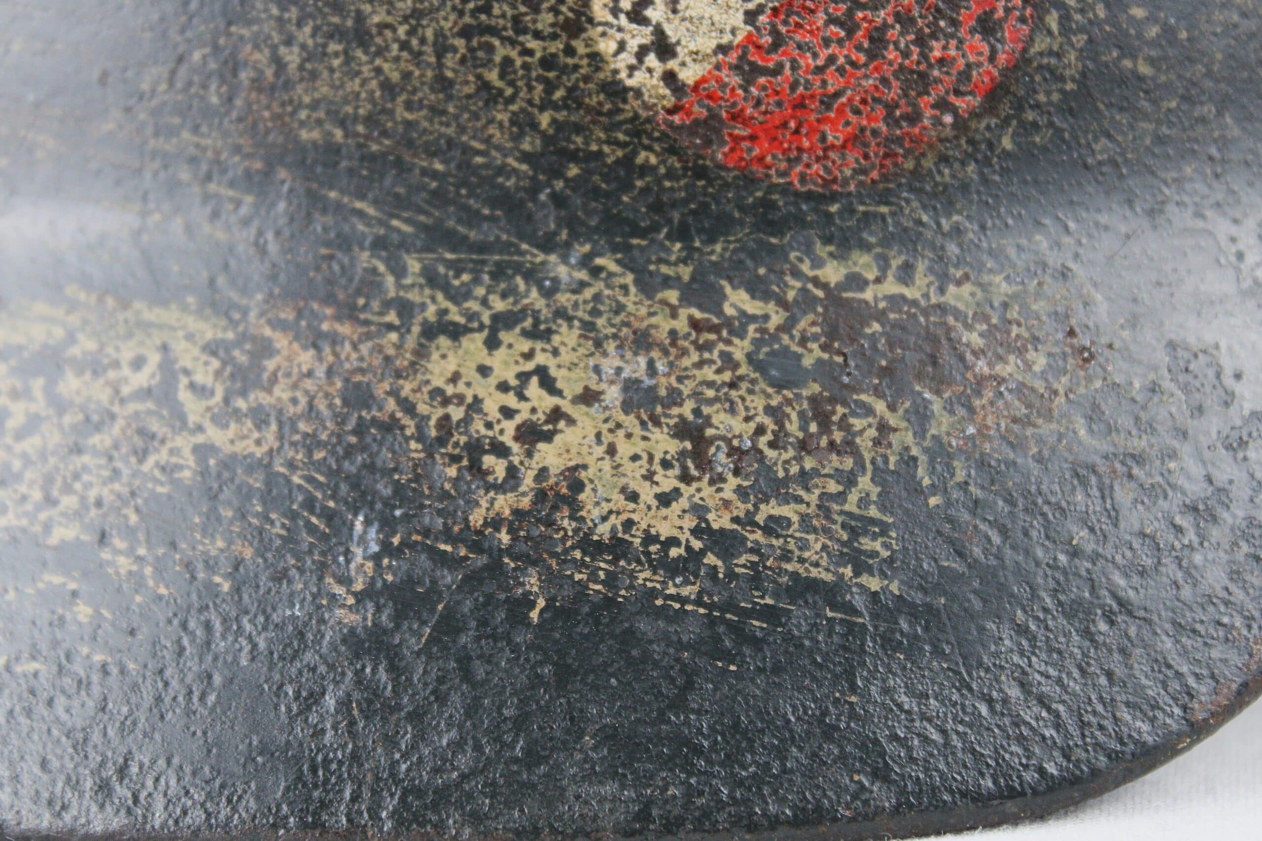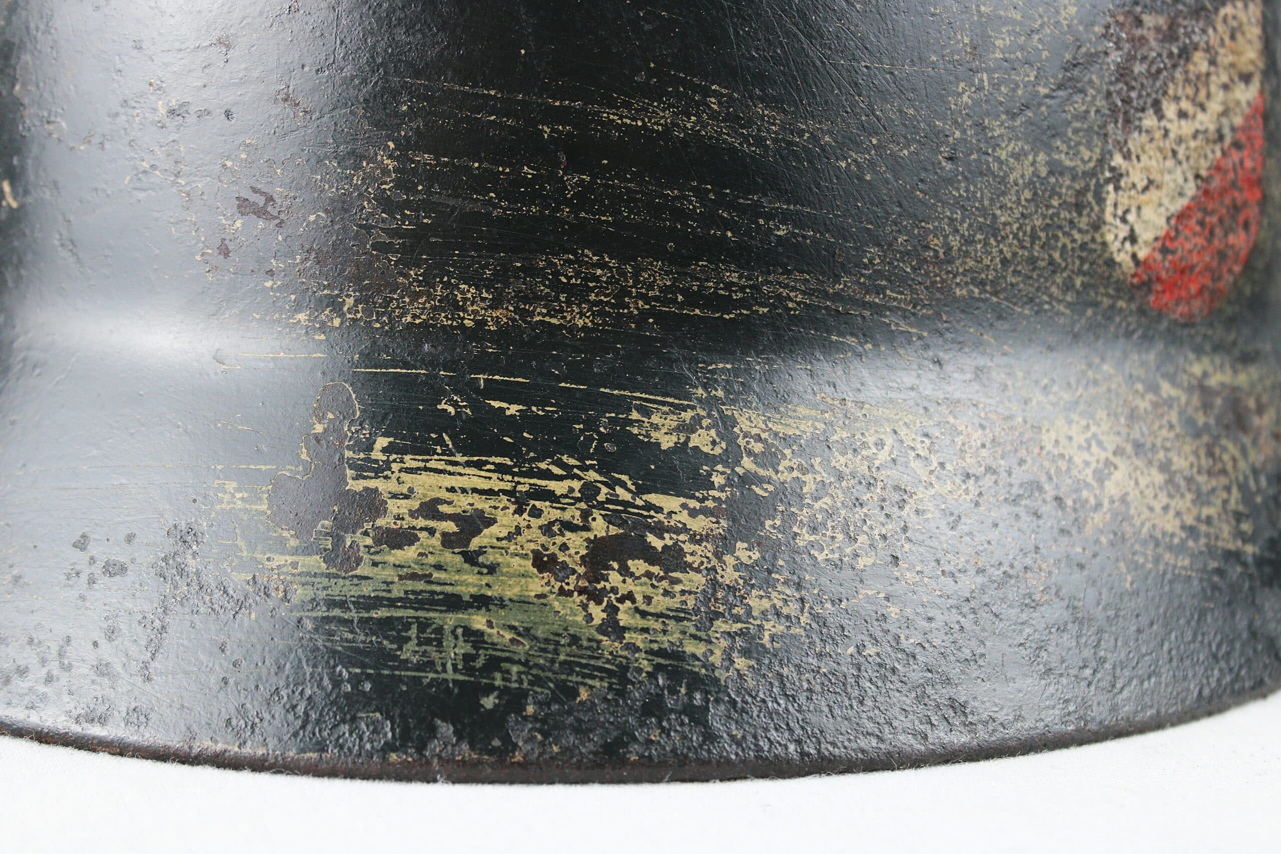 Coque de casque M35 de la Luftwaffe double décales, trace de l’aigle du 2eme type et tricolore encore très présent. La coque a reçu une peinture après guerre recouvrant un très beau camouflage 2 tons.