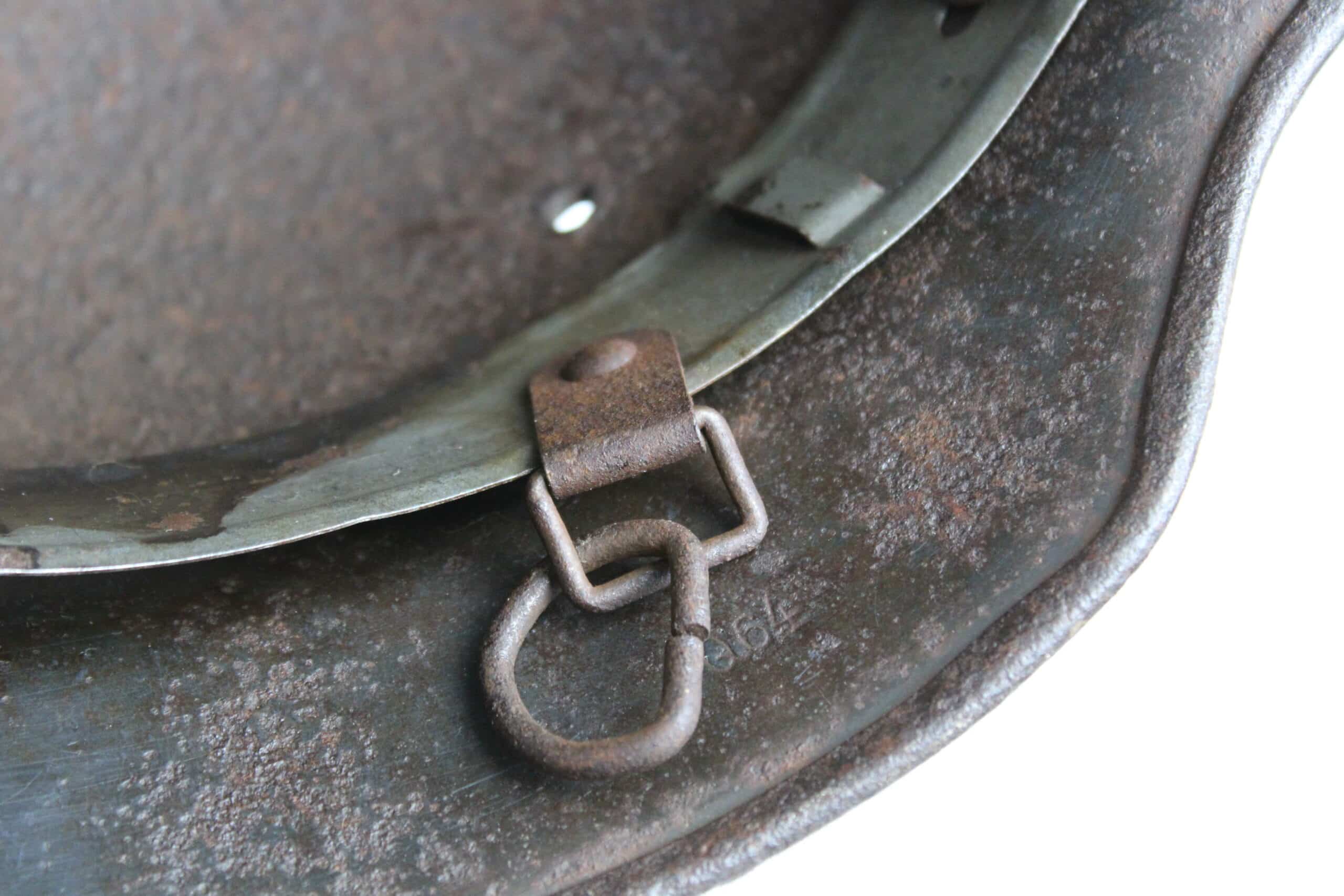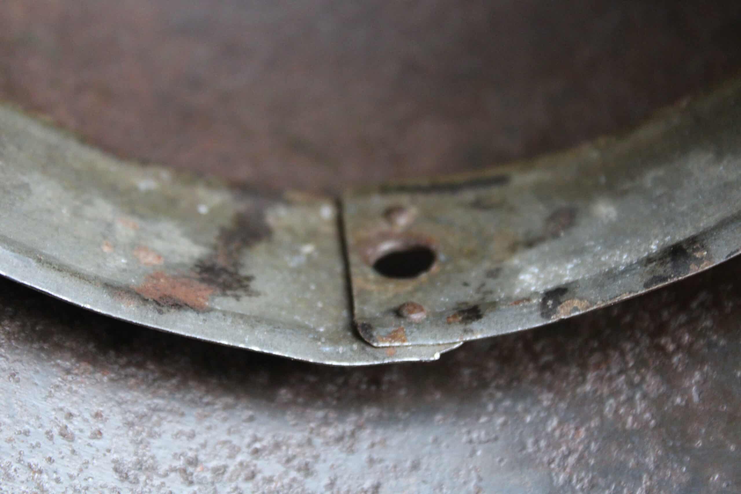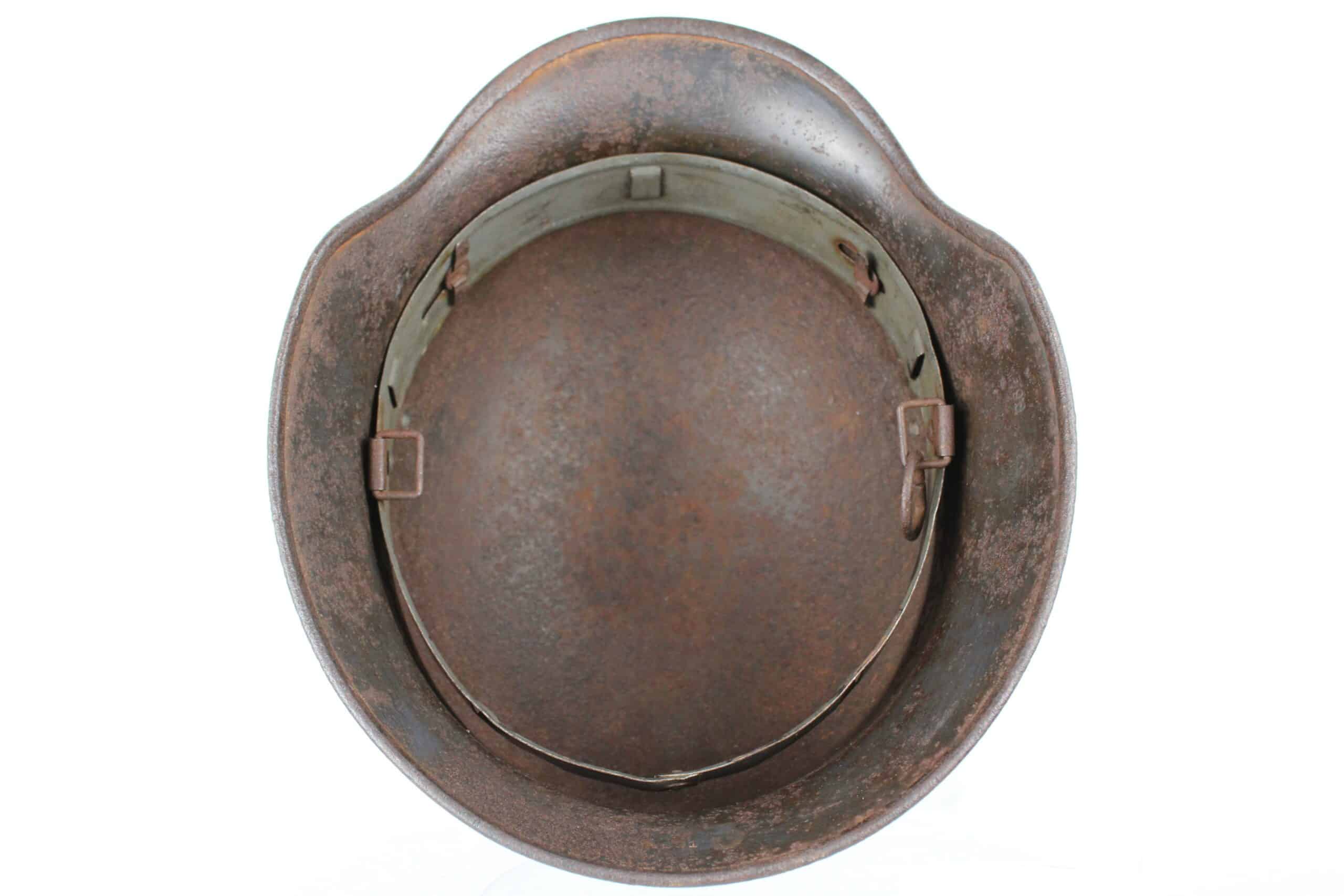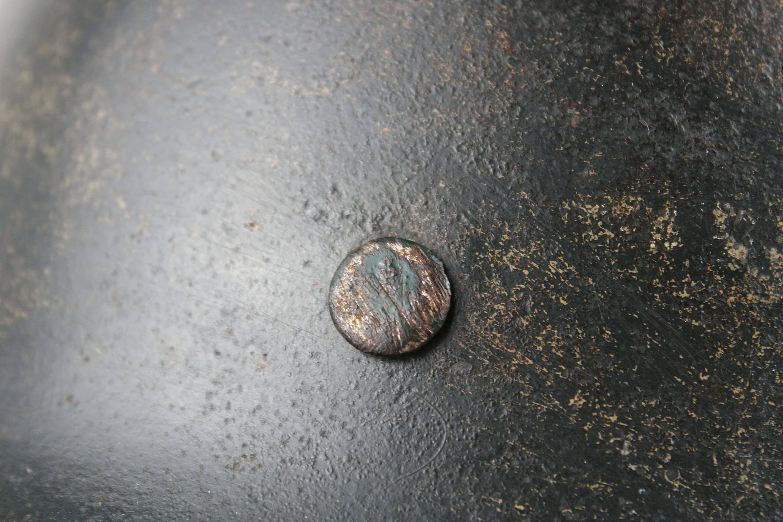Coque de casque M35 de la Luftwaffe double décales, trace de l’aigle du 2eme type et tricolore encore très présent. La coque a reçu une peinture après guerre recouvrant un très beau camouflage 2 tons.