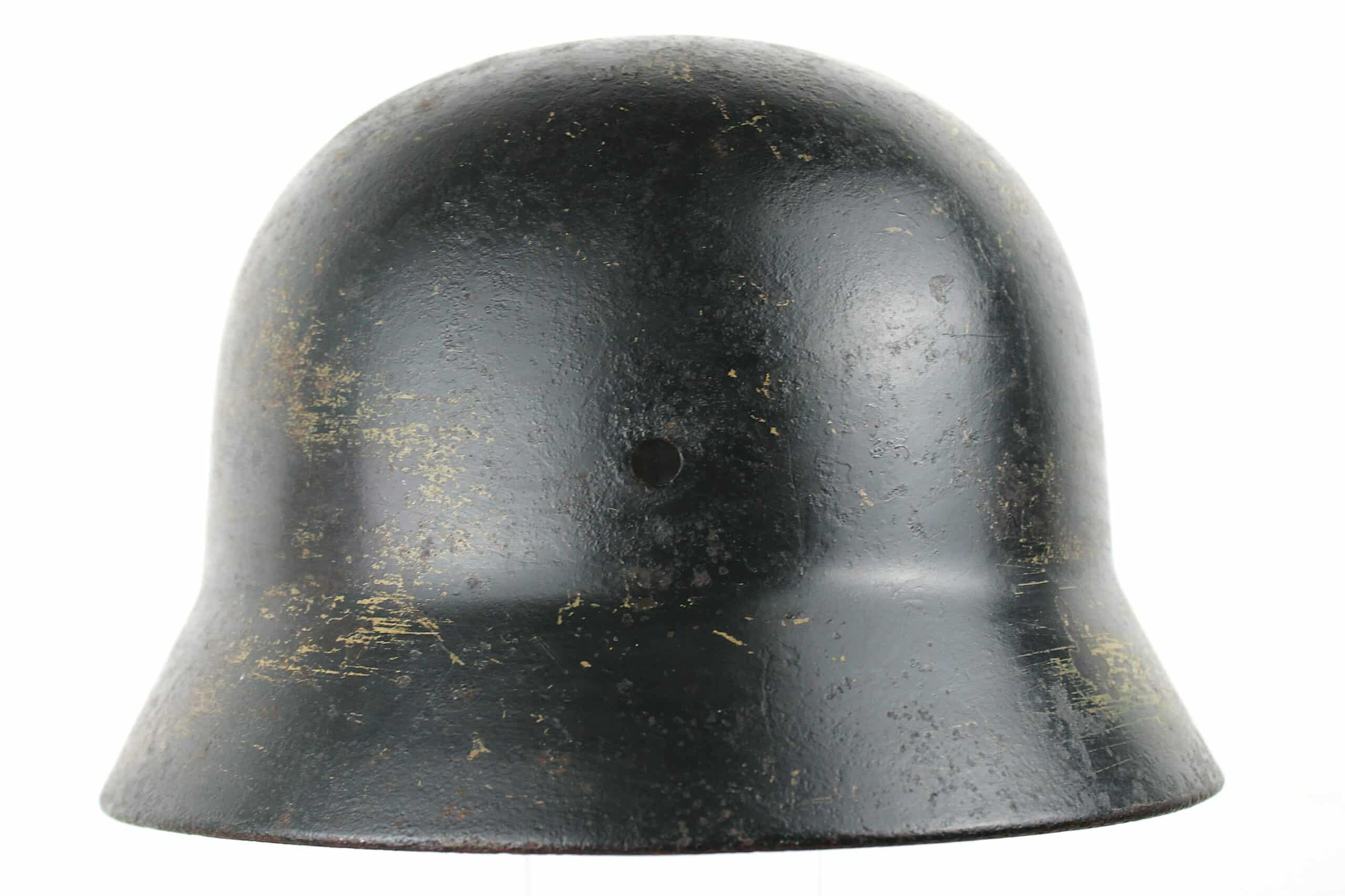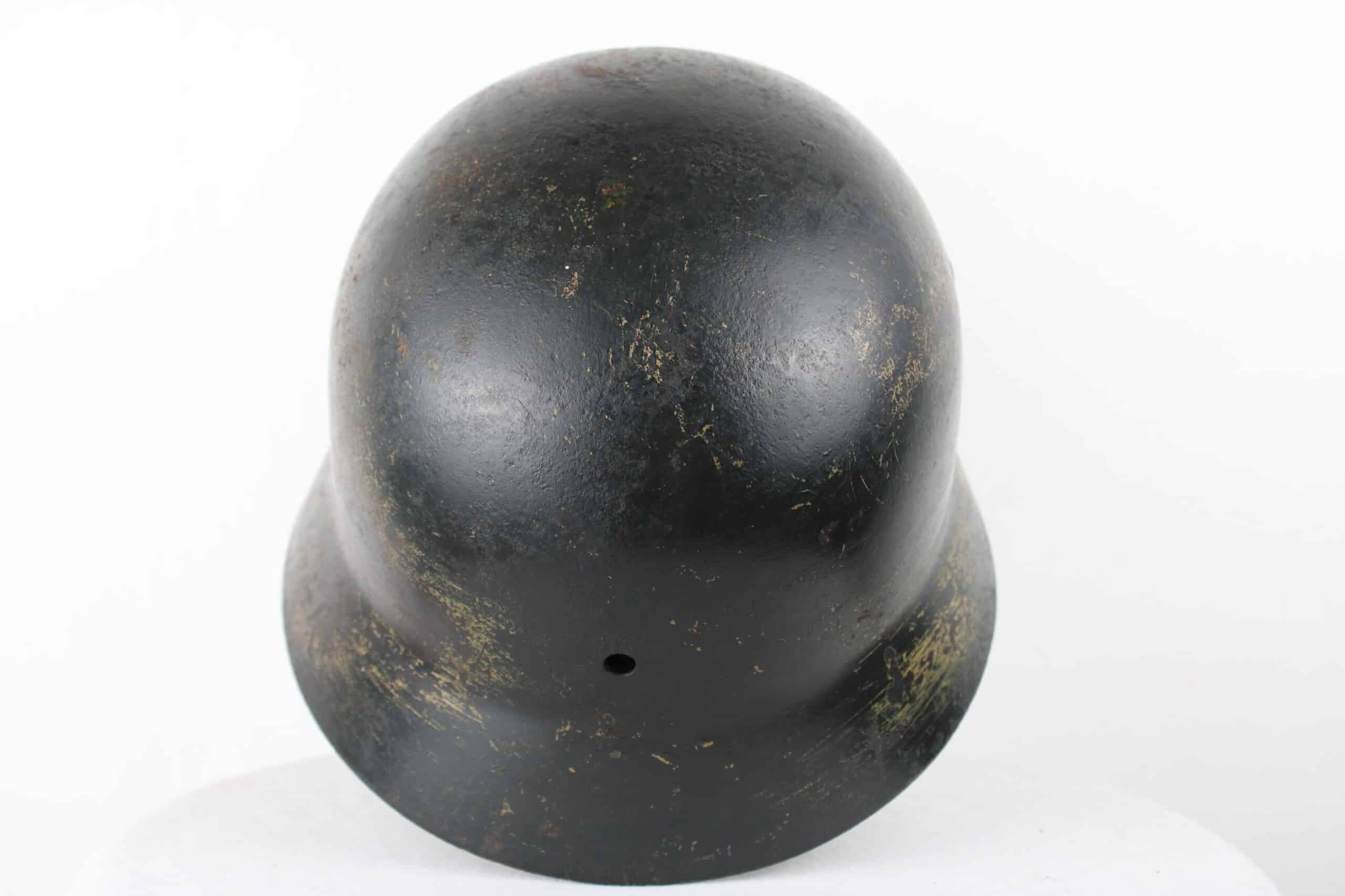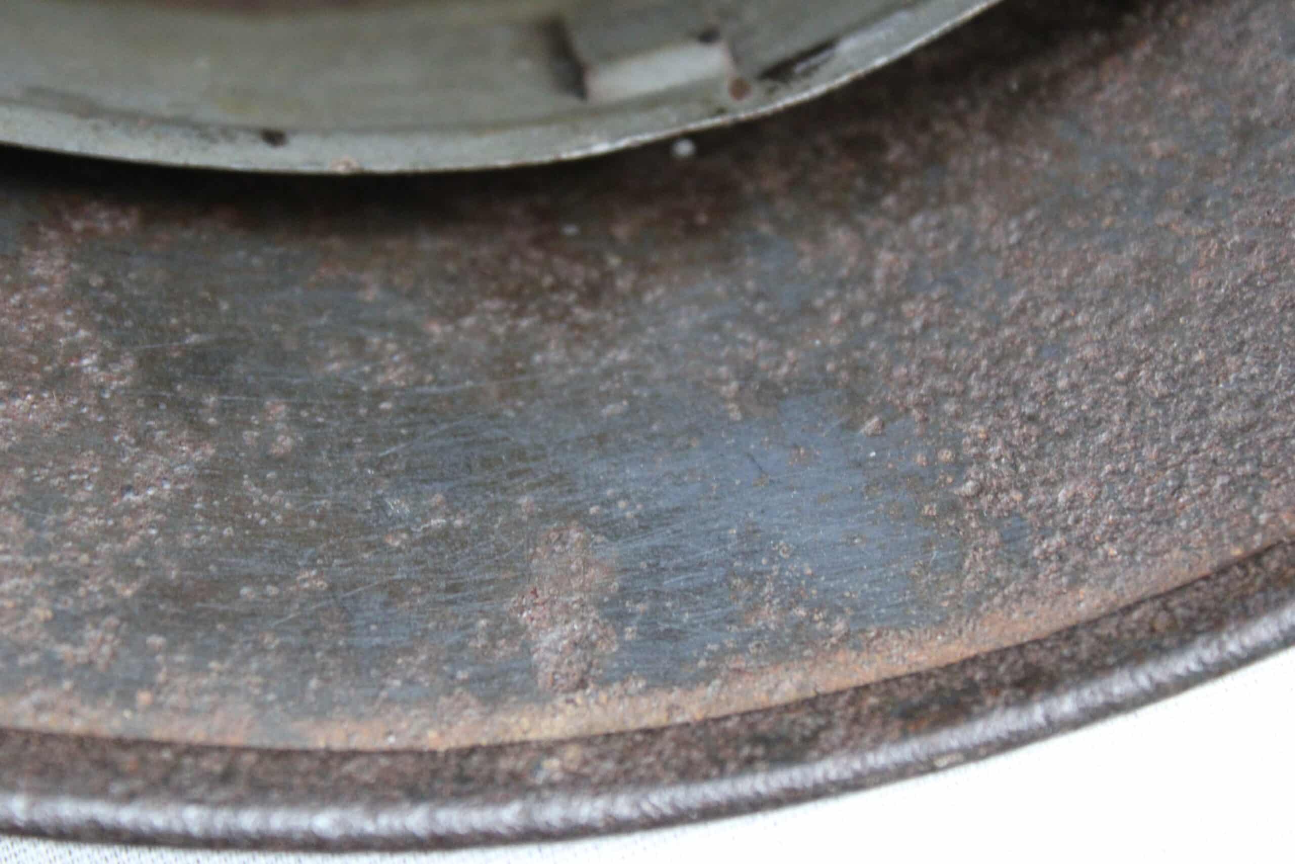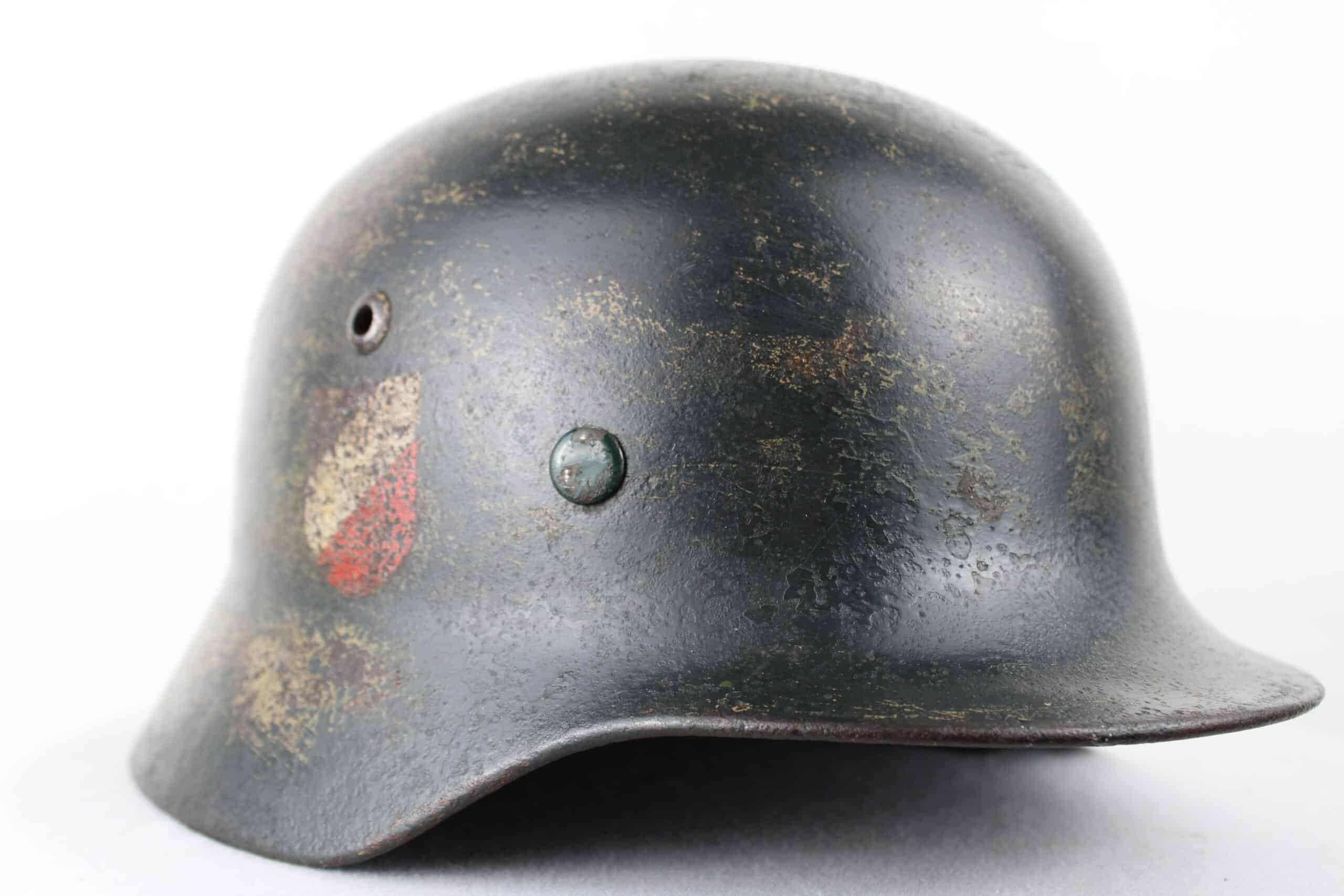 Coque de casque M35 de la Luftwaffe double décales, trace de l’aigle du 2eme type et tricolore encore très présent. La coque a reçu une peinture après guerre recouvrant un très beau camouflage 2 tons.