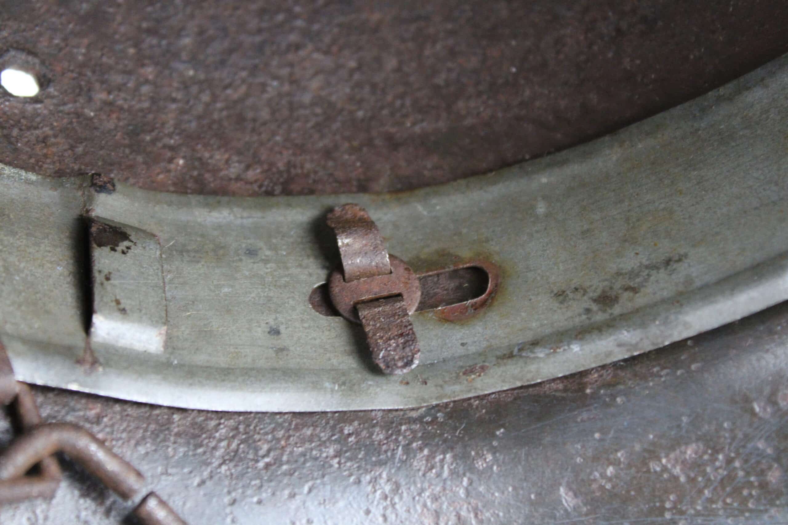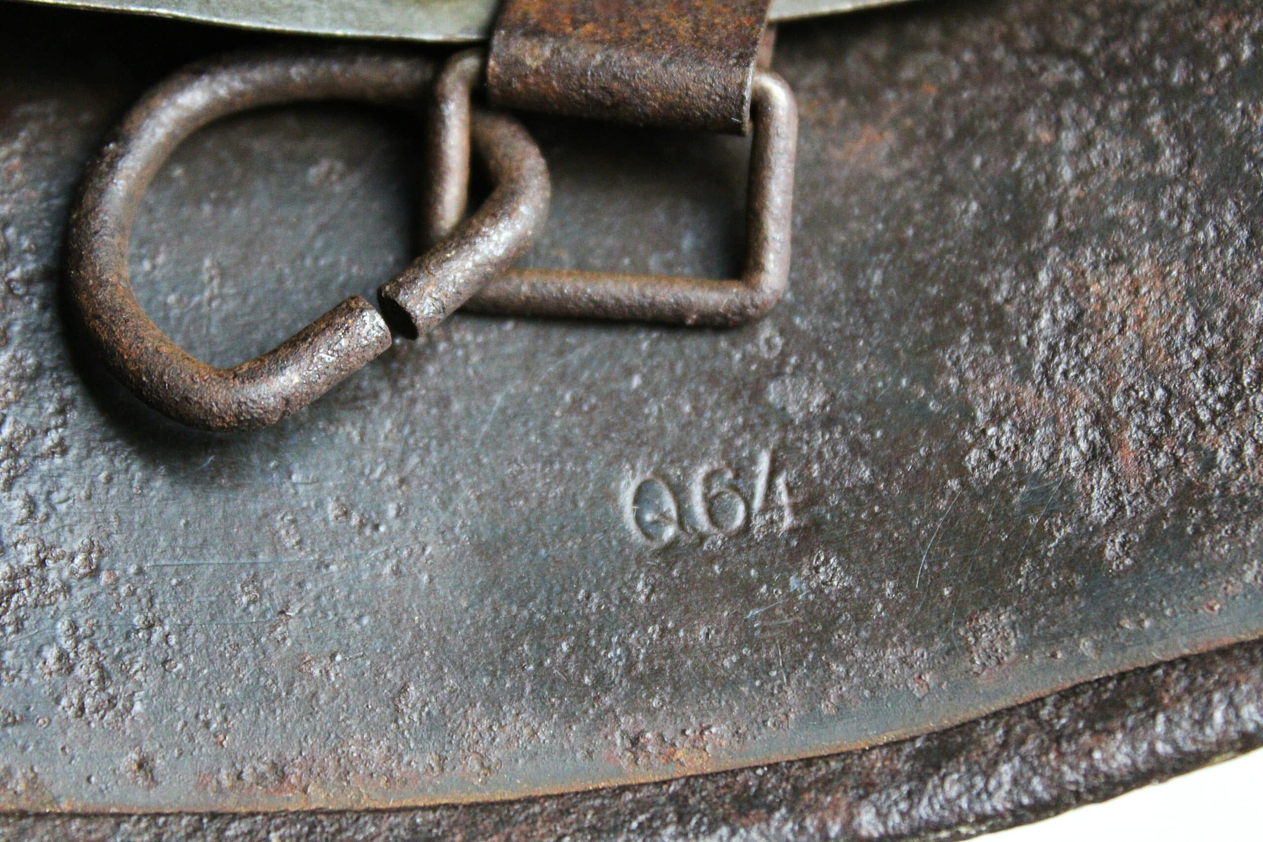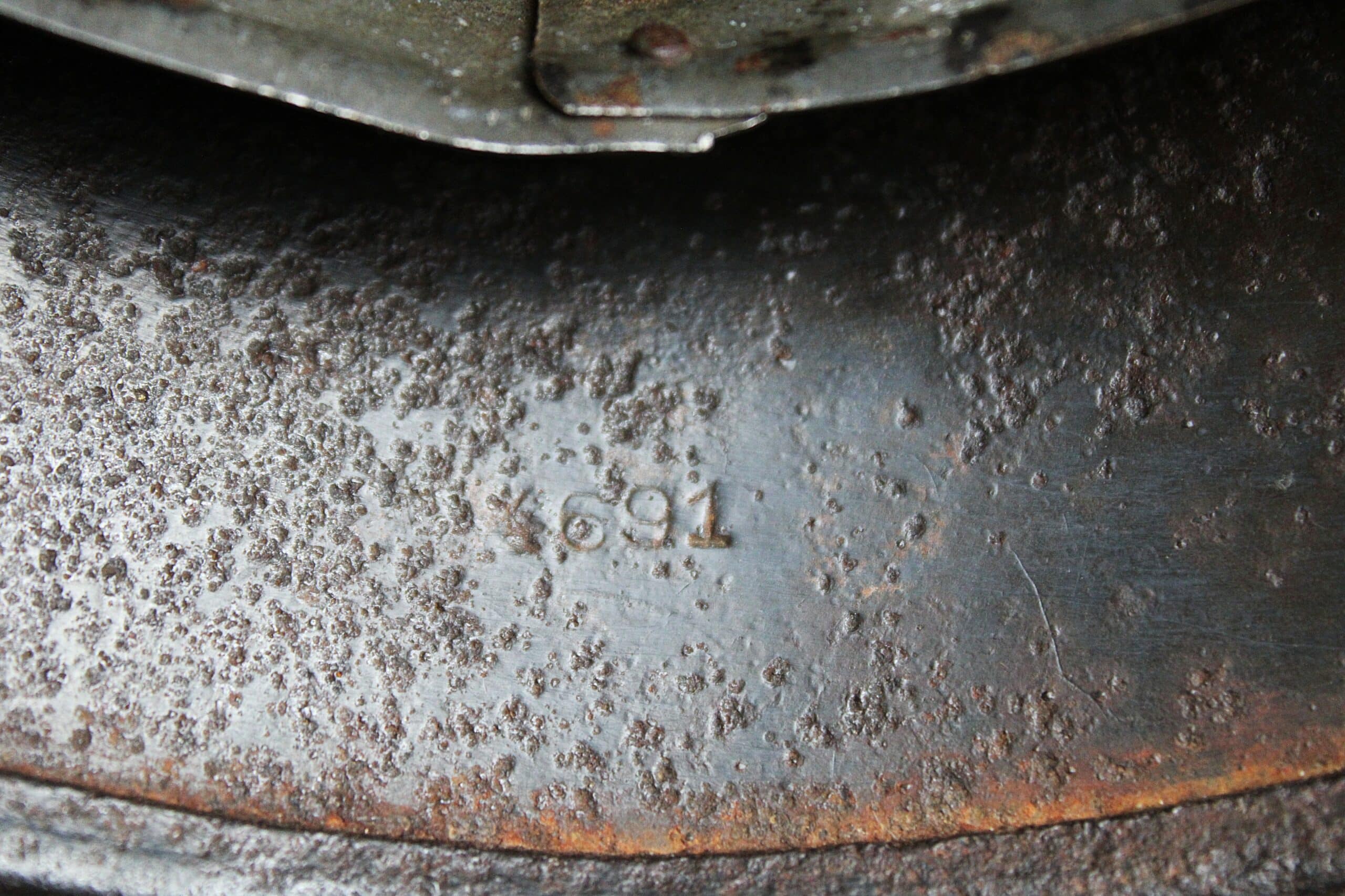 Marquage fabricant « Q64 » et numéro de série « 4691 » bien visible, cerclage encore en place maintenu par 2 rivets.