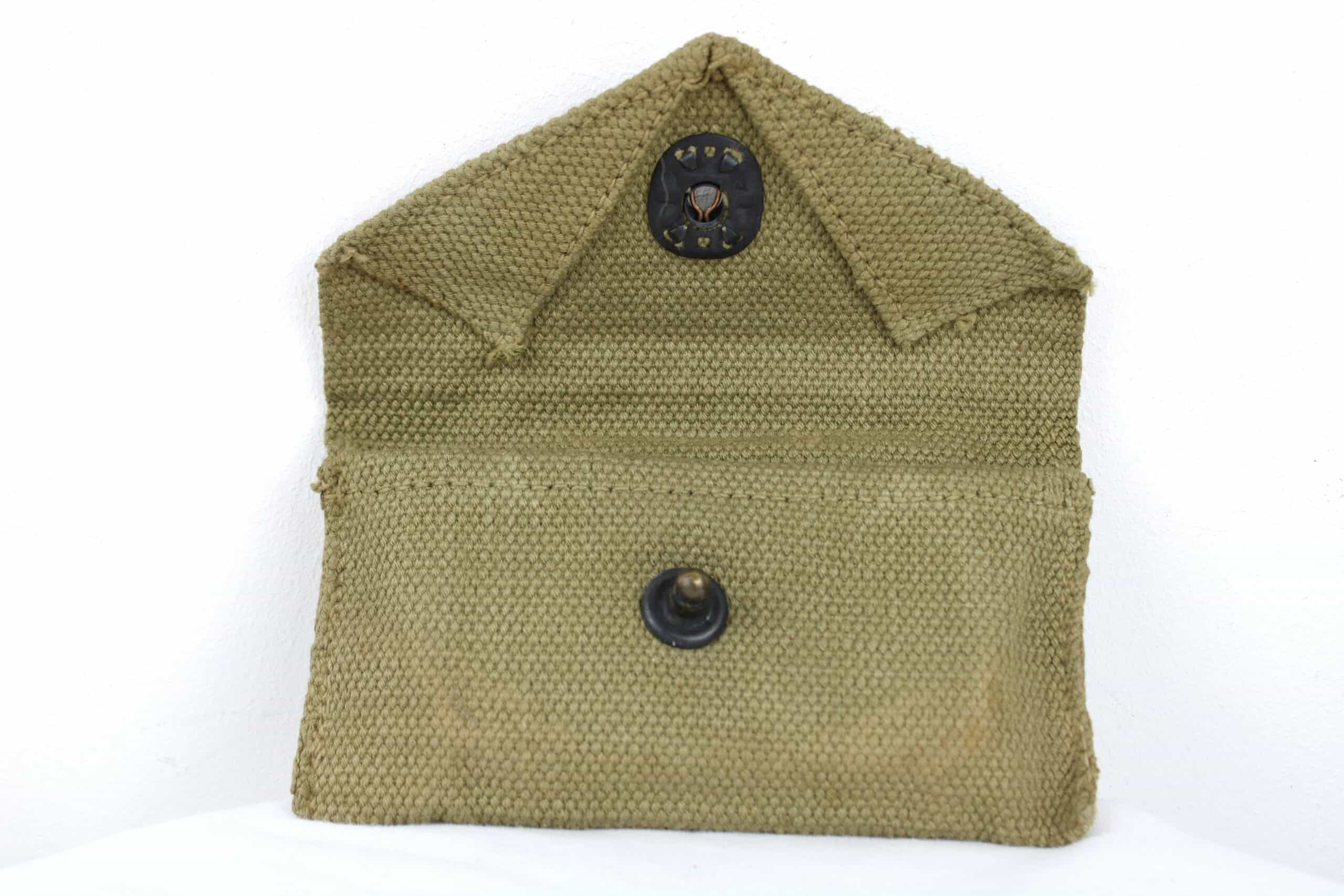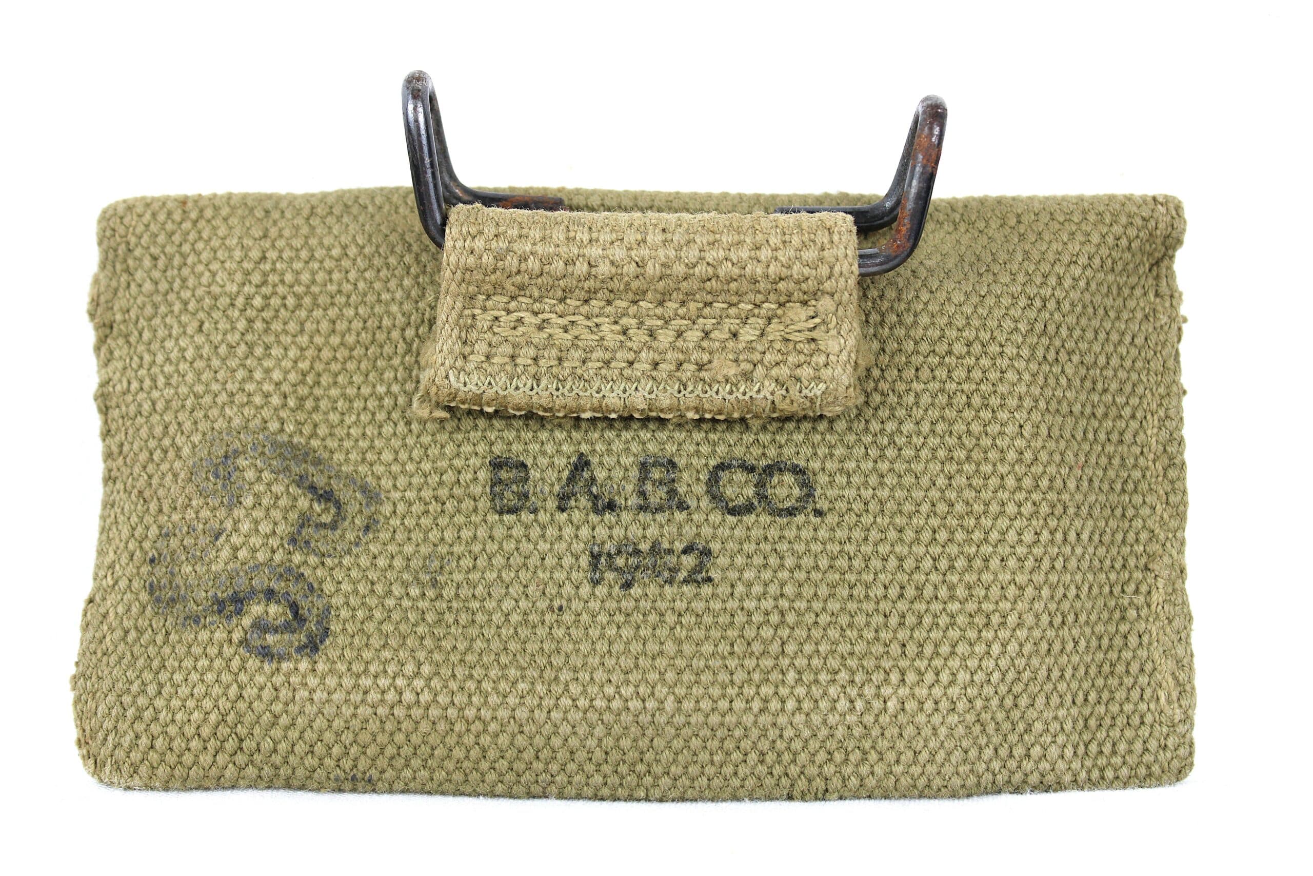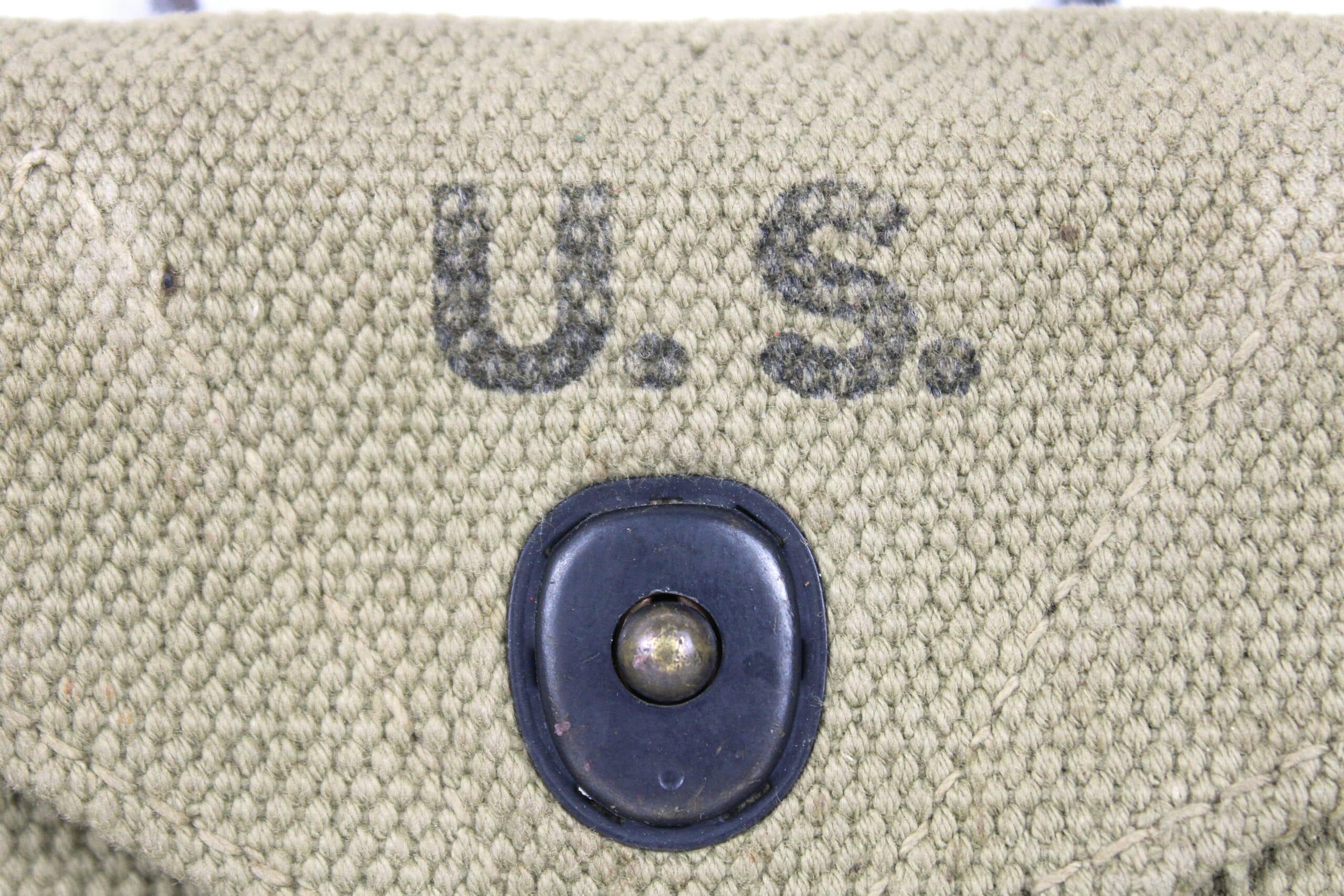 fermeture en bon état , marquage US frontal parfait, marquage fabricant à l’arrière et daté 1942, crochet de ceinturon présent, initiales du porteur tamponnées à l’arrière.