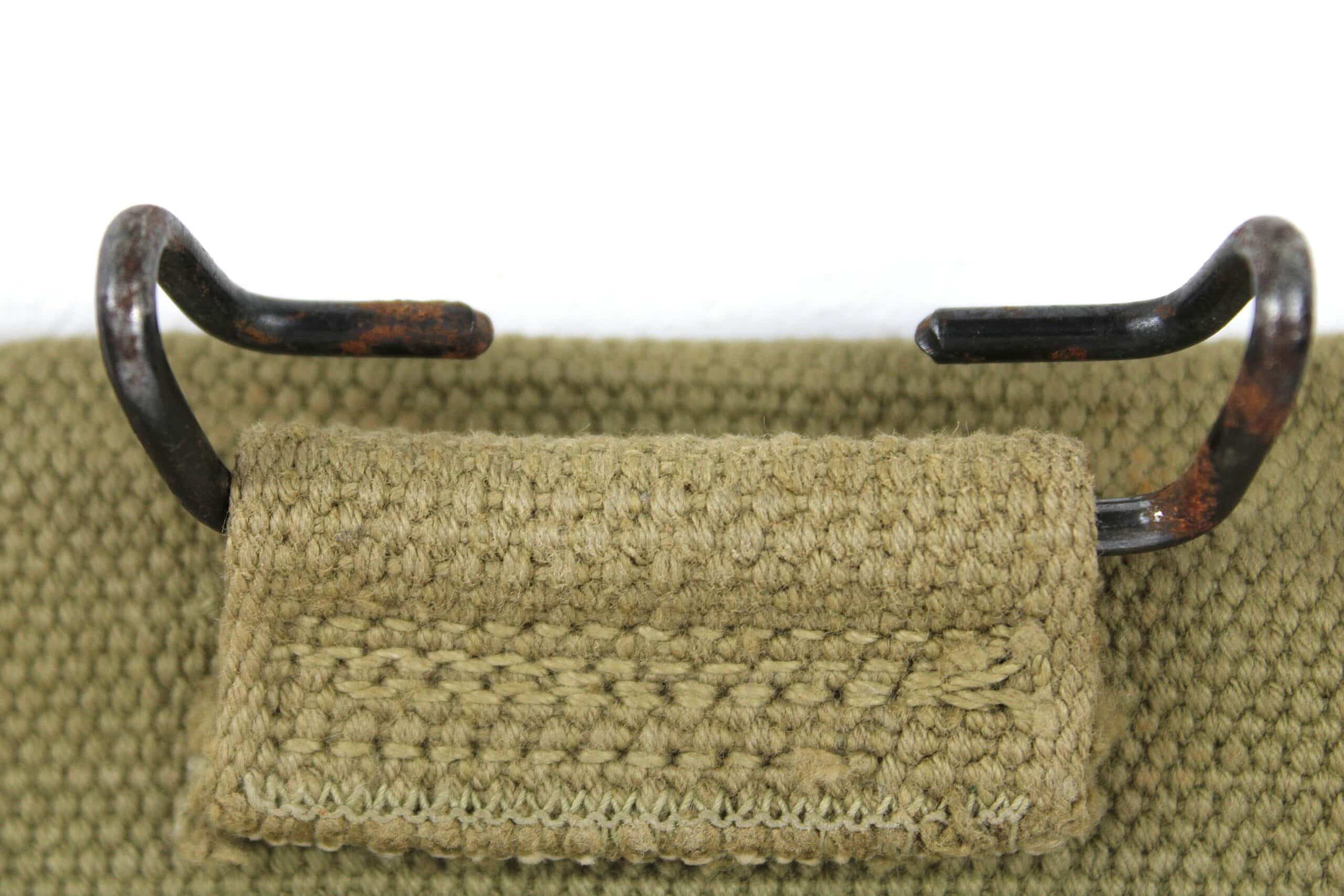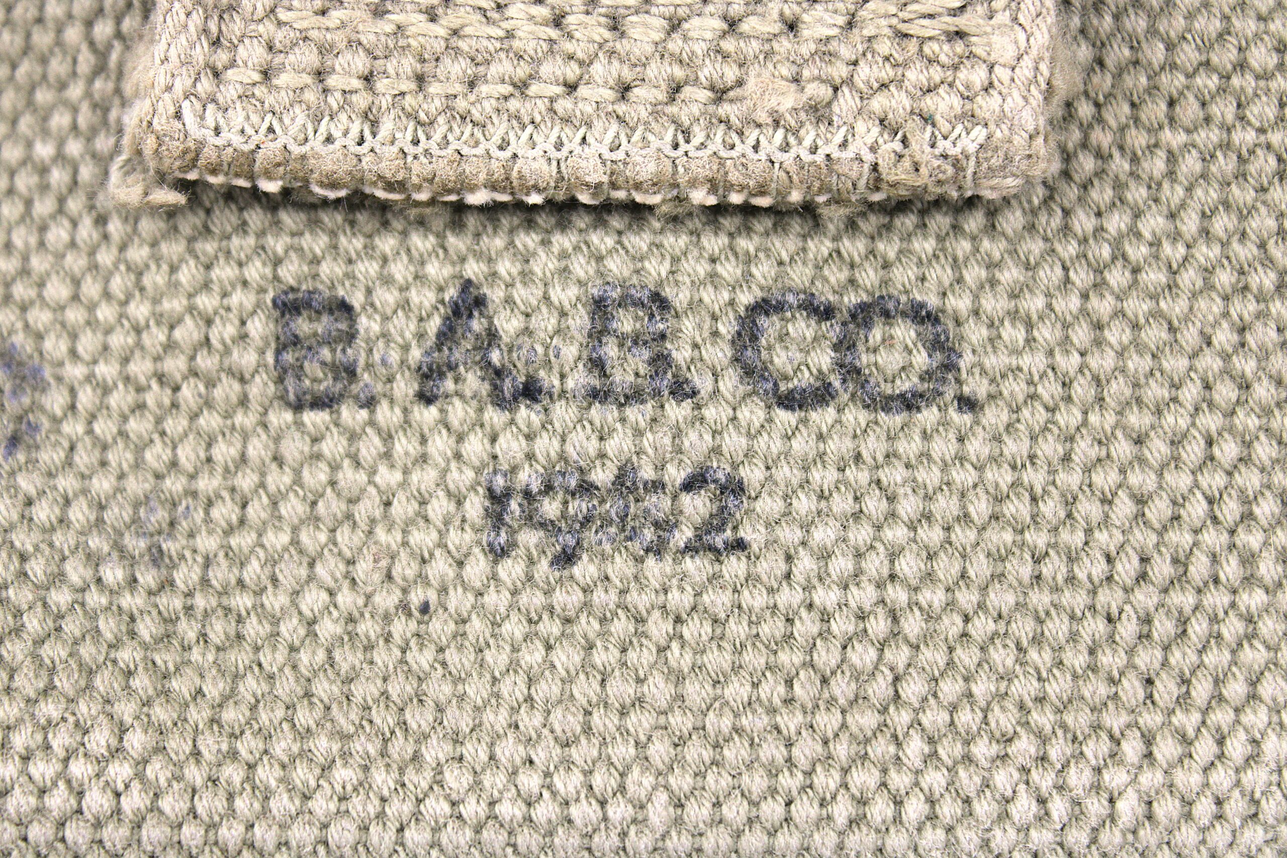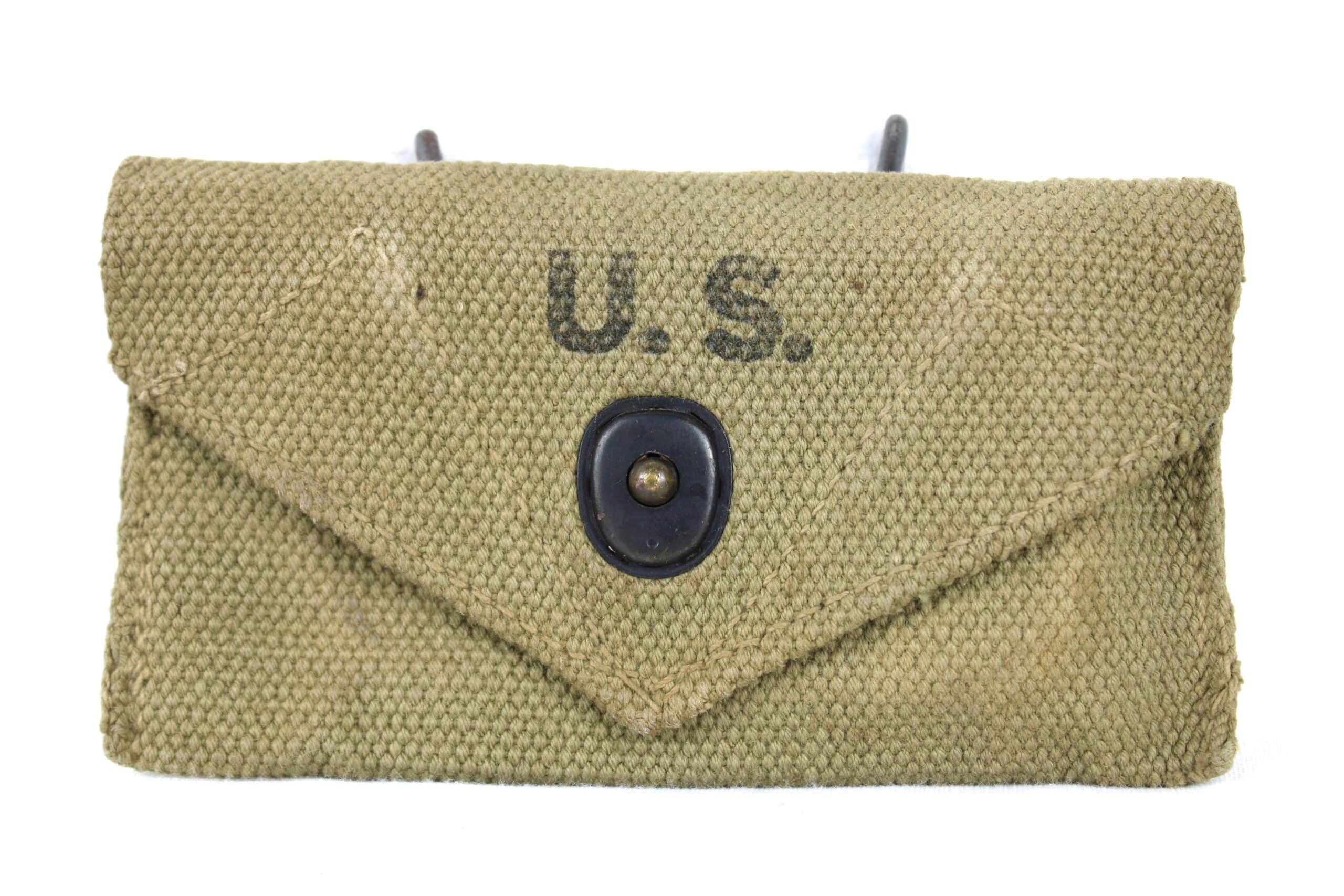 fermeture en bon état , marquage US frontal parfait, marquage fabricant à l’arrière et daté 1942, crochet de ceinturon présent, initiales du porteur tamponnées à l’arrière.