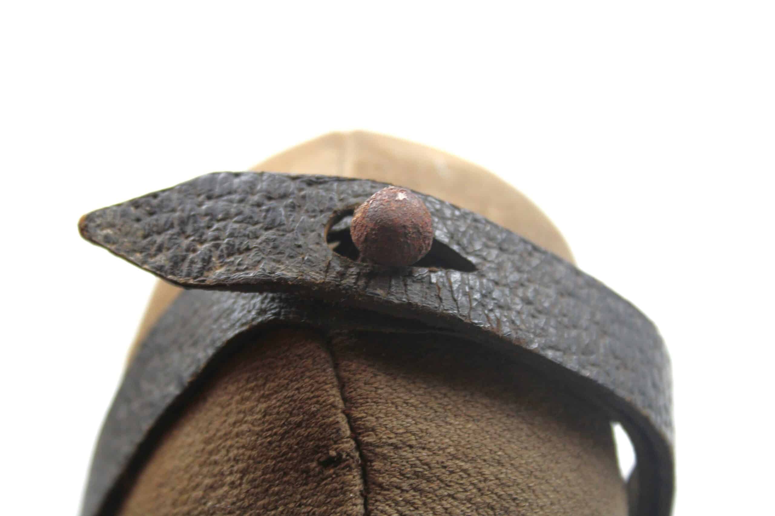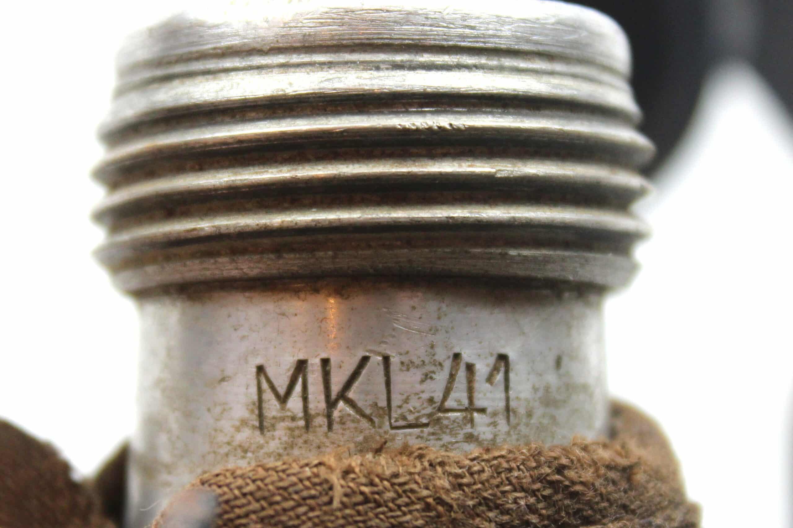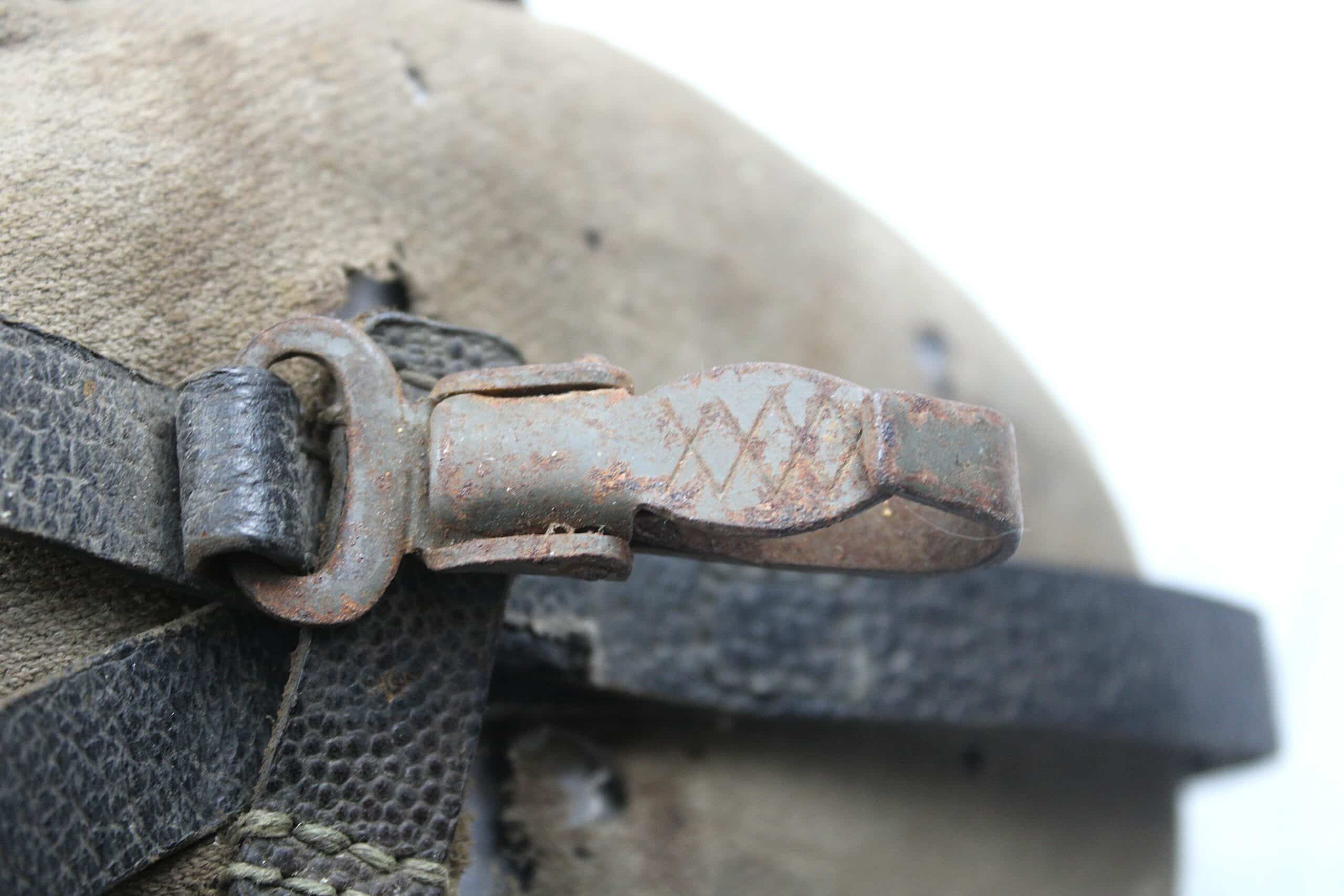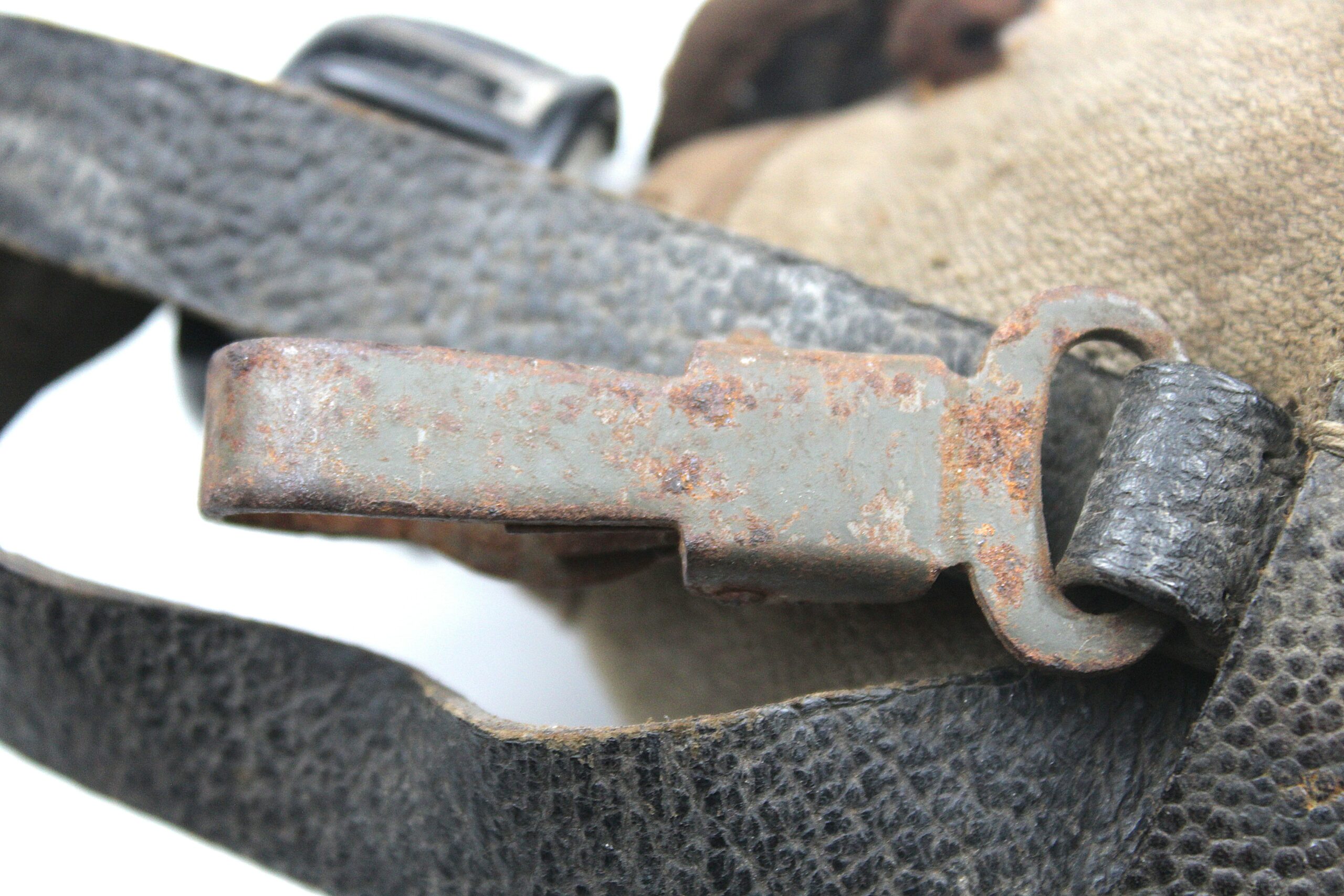 Les boutons de la housse sont fonctionnels mais le 1er reste fragile, brelage en cuir de porc tardif sans marquage, crochet de suspension peint en Feldgrau sans marquage, boucle de fermeture fonctionnelle, bouchon en bakélite noir s’ouvre et se ferme sans soucis, joint présent.
