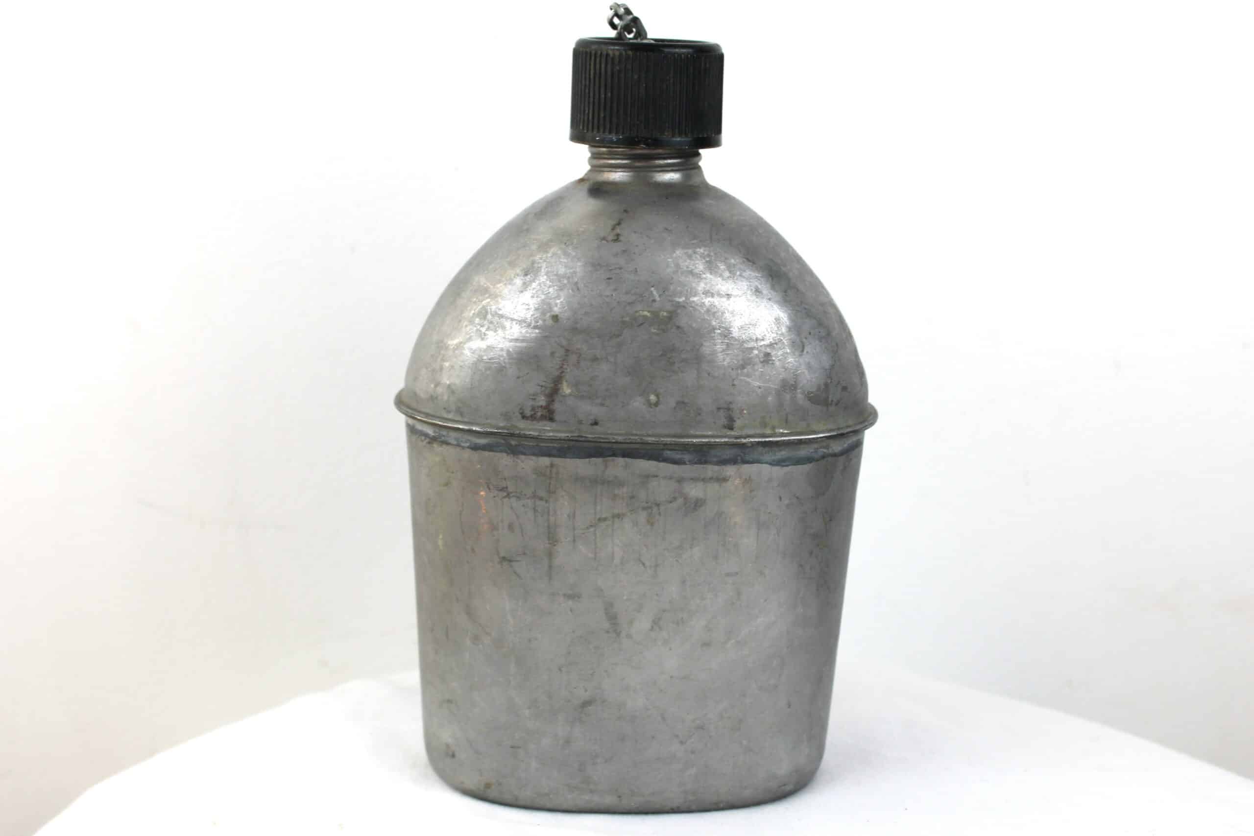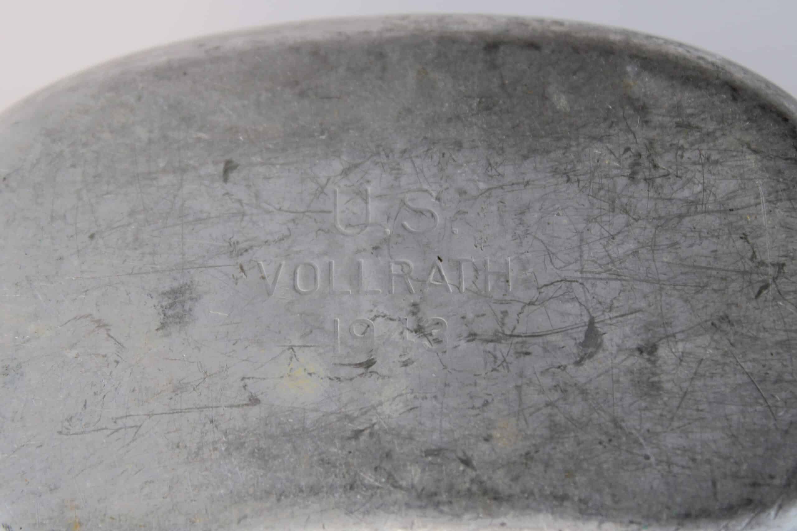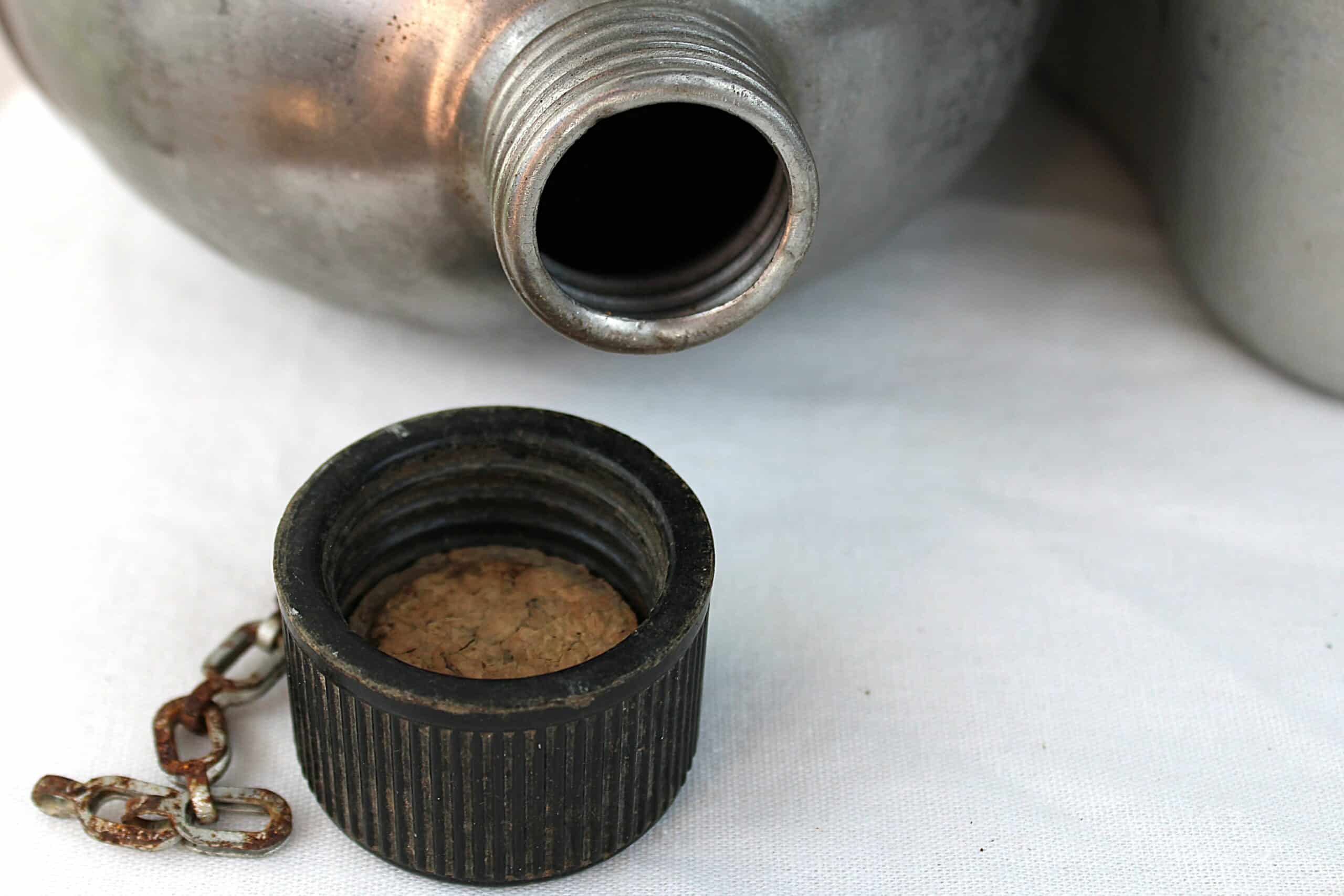 Gourde du fabricant Vollrath datée 1943 en bon état général , bouchon plastic bien présent avec son liège, la chaine n’est plus solidaire à la gourde.