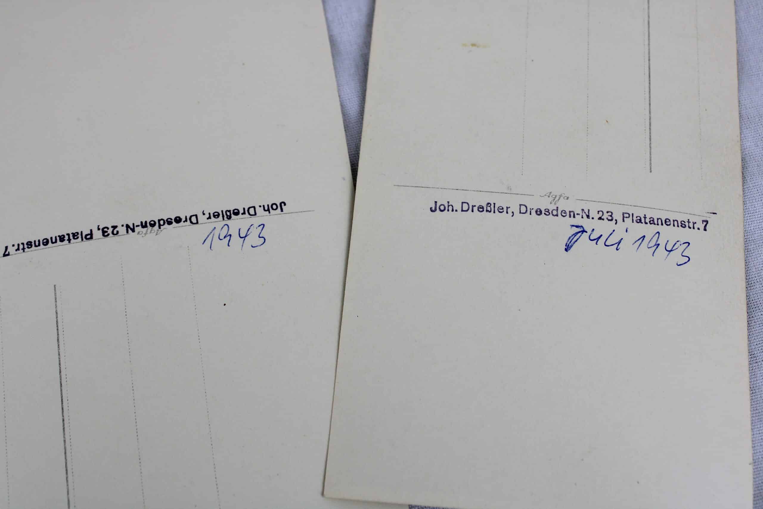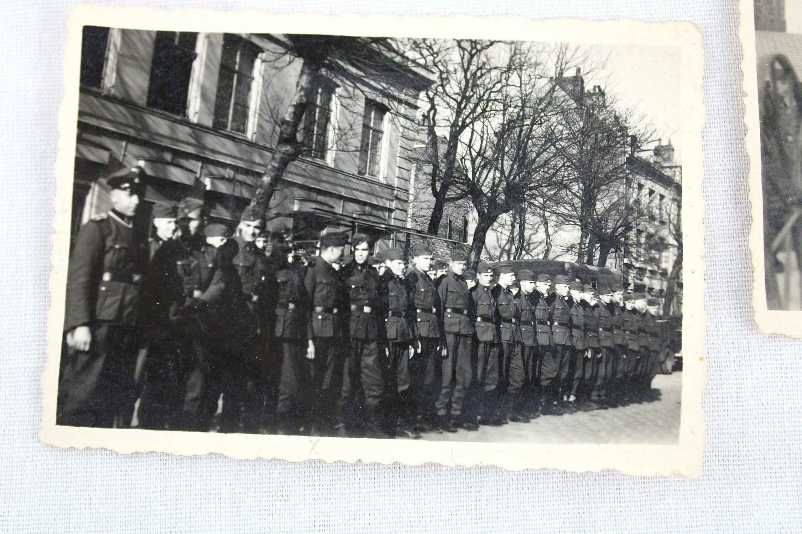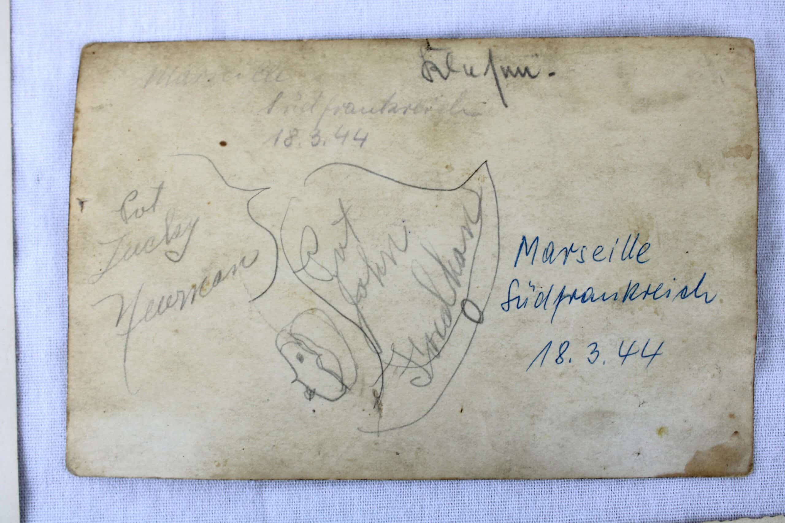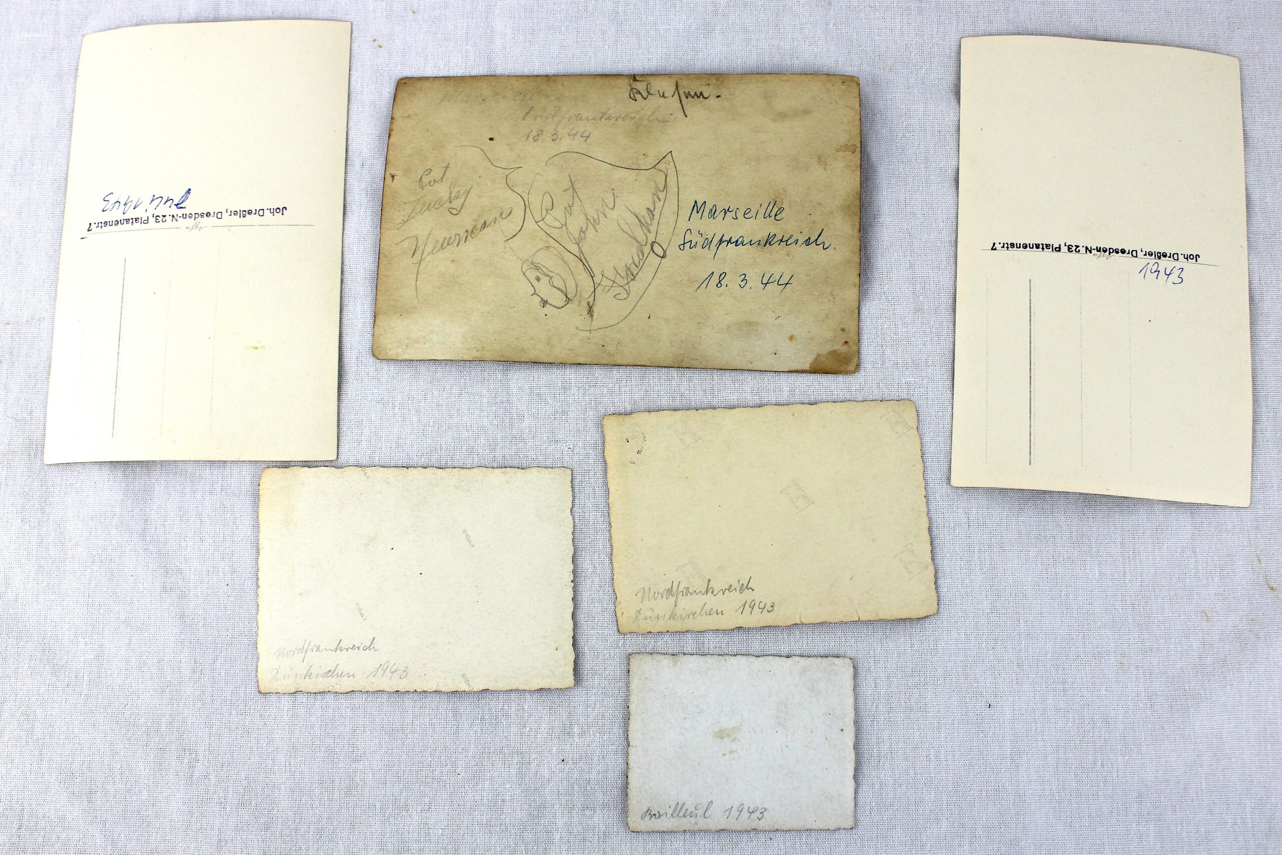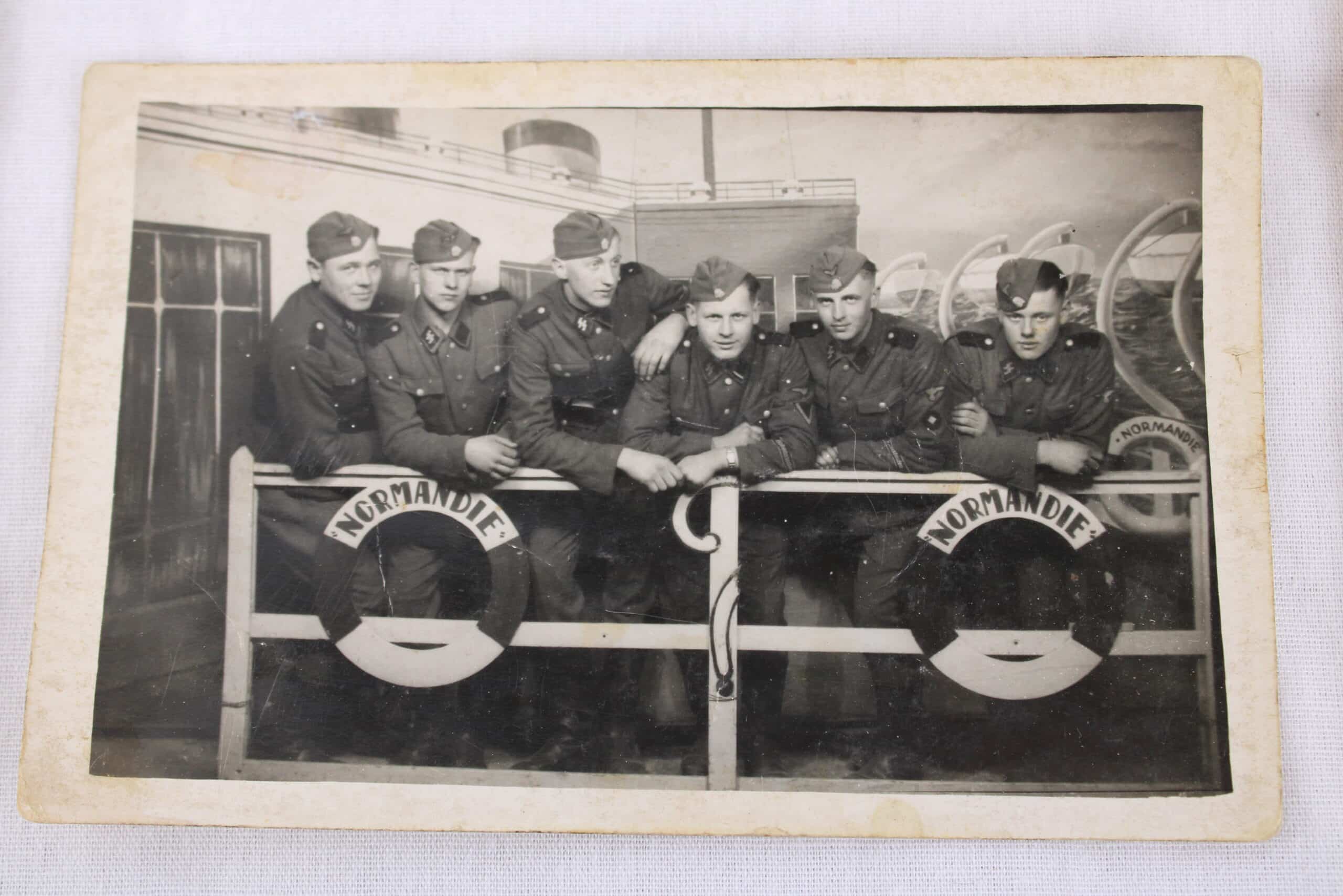 Les 3 plus grandes sont au format carte postale, 2 sont faites dans un atelier de Dresde et la photo de groupe réalisée dans un atelier de Marseille le 18 Mars 1944 avec les bandes de bras bien visibles, ironie du sort le décor représente le paquebot « Normandie » … région qui sera fatale pour cette division.