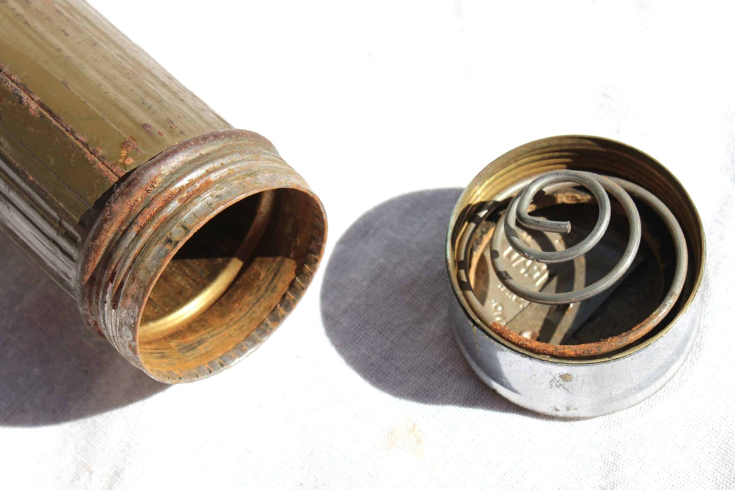 Corps en acier peint OD , bouchon de pile en inox, la peinture n’a malheureusement pas tenu sur l’inox, verre présent sans casse, interrupteur en parfait état de fonctionnement, ampoule d’origine présente, clips d’accroche en place et sans jeu.