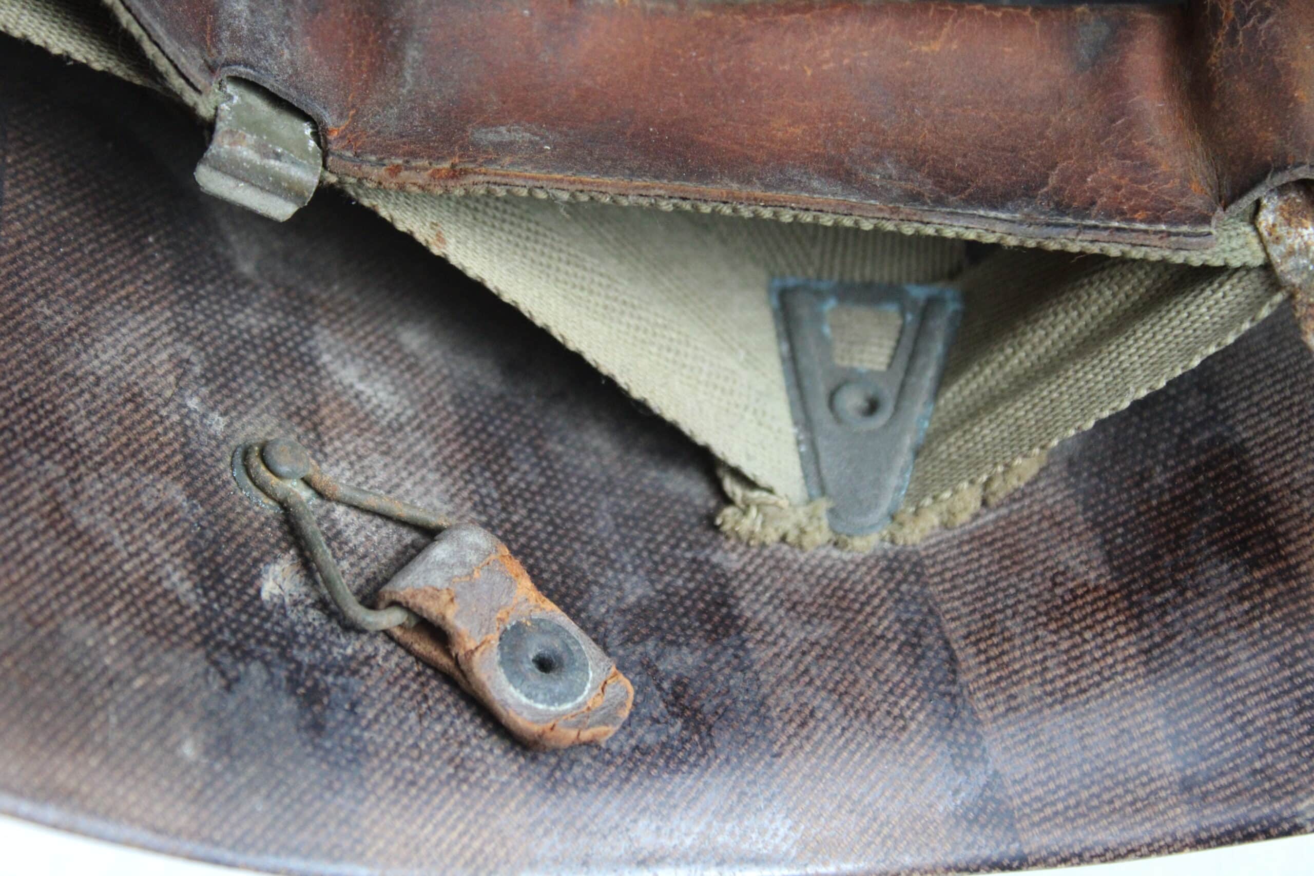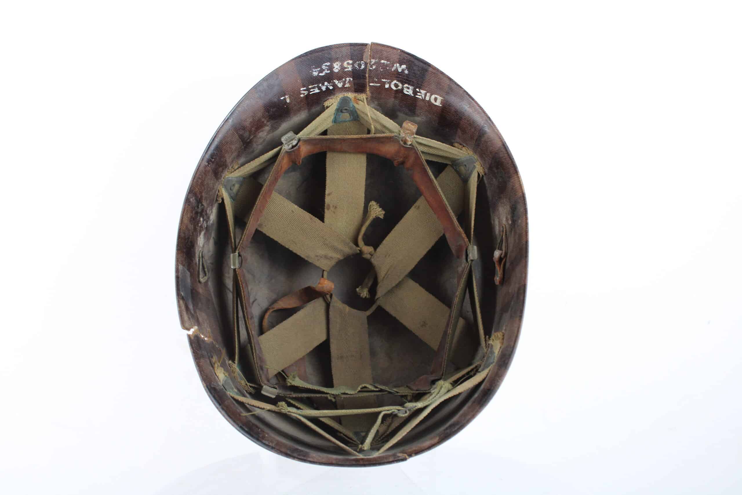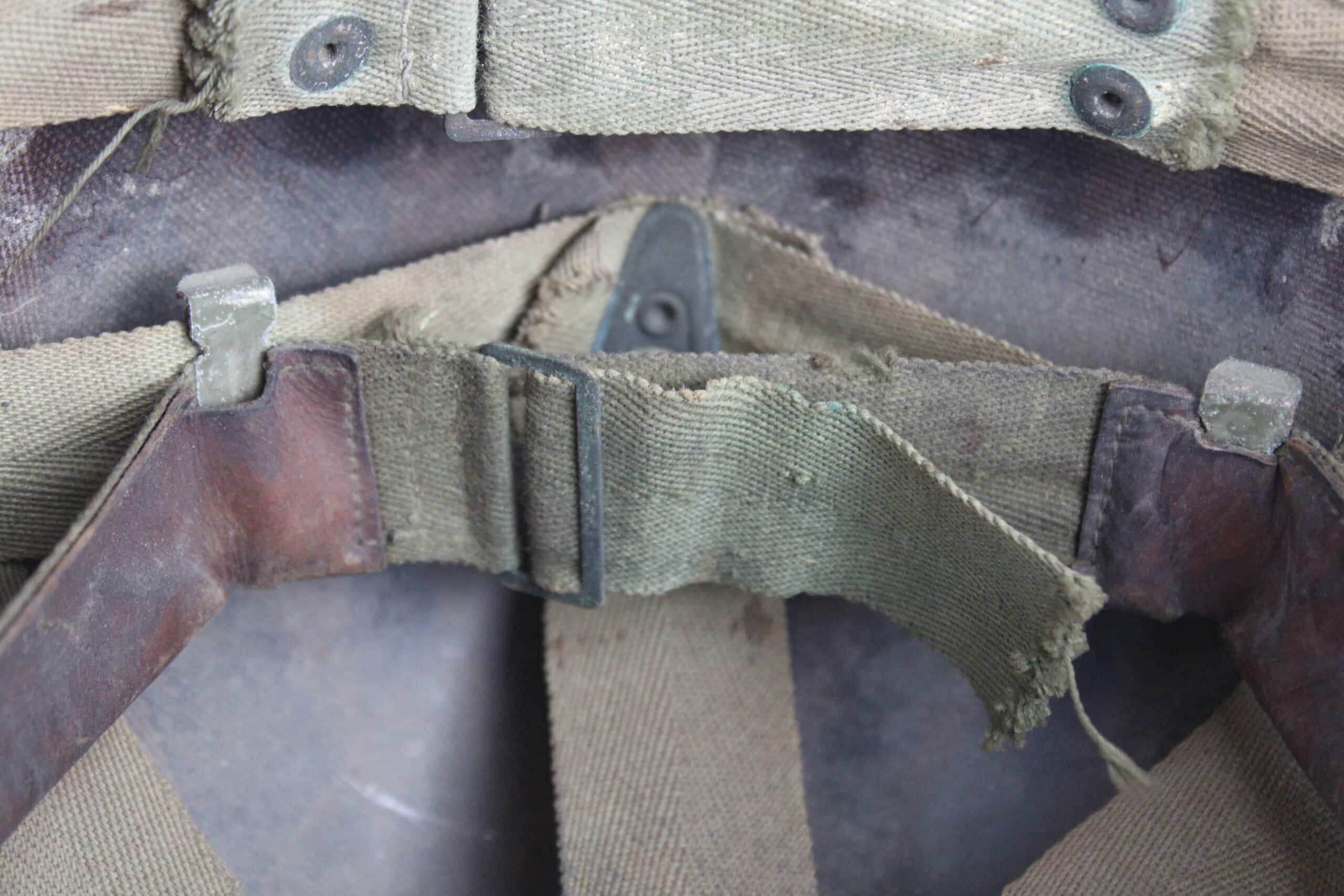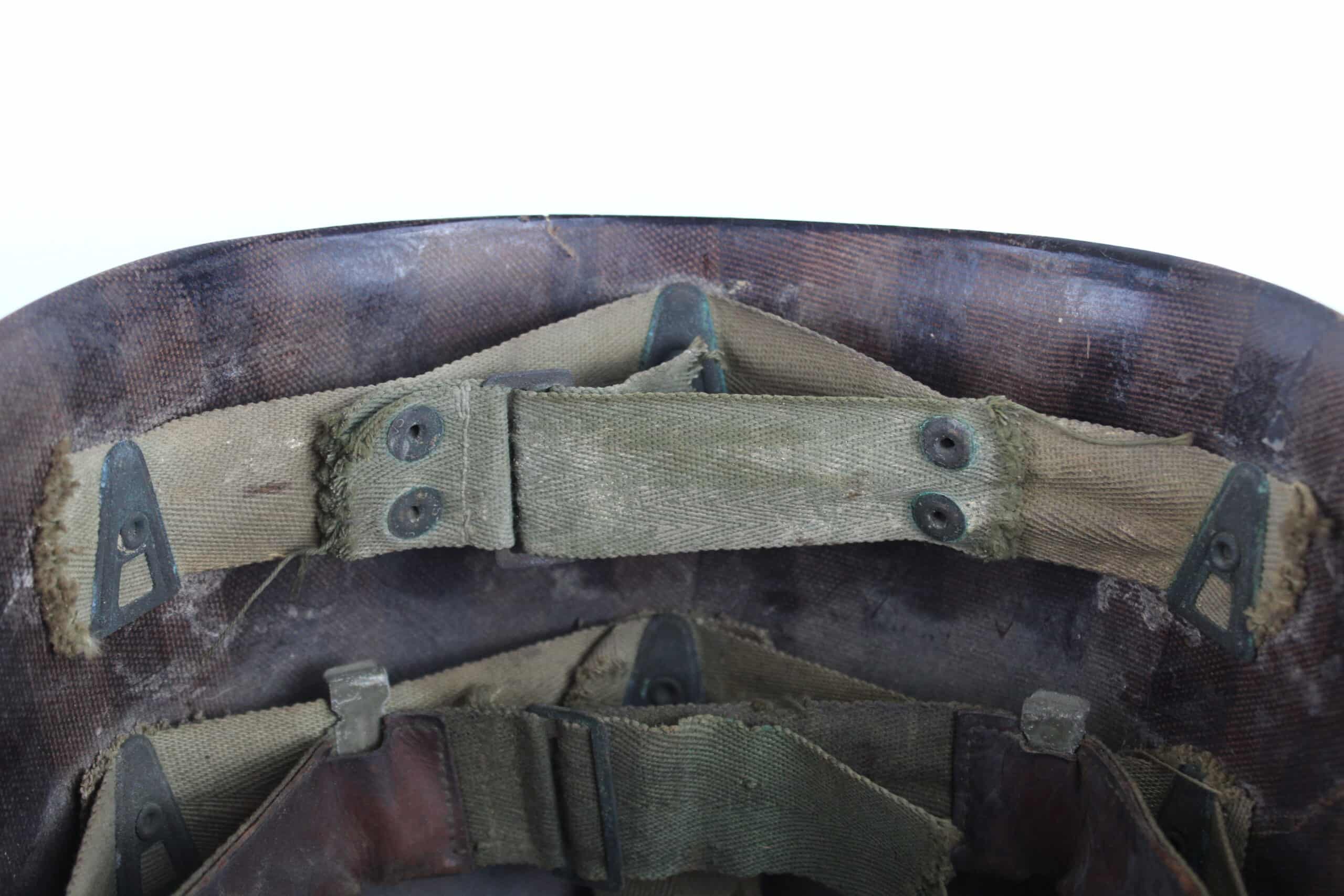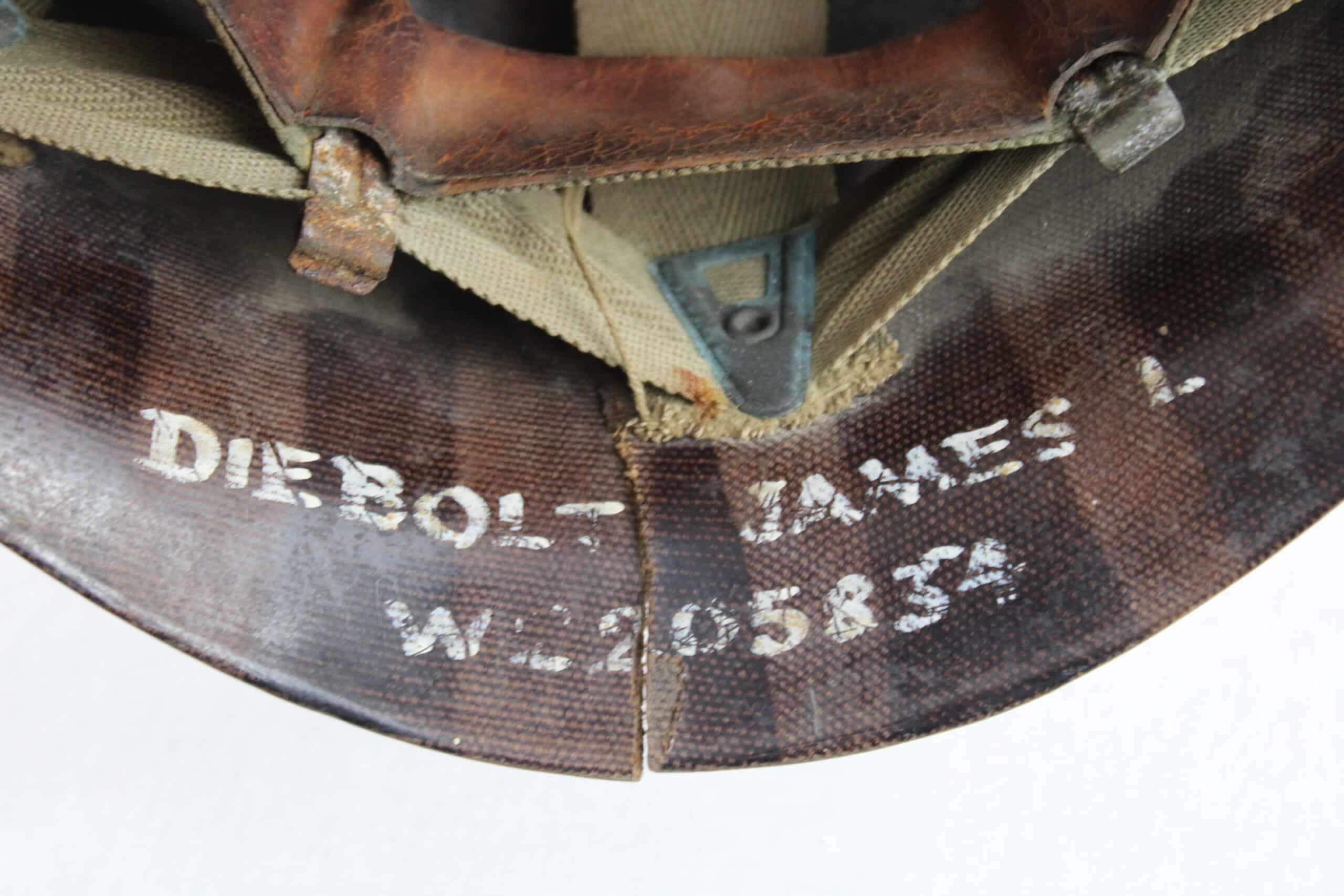 Peinture extérieur OD quasi complète, insigne de Warrant Officer Junior peint à l’avant, l’intérieur est plutôt complet et sans accident, A- frame en laiton noirci typique des fabrications tardives, Neckband réglable présente en toile OD7, Sweat band présente et bien montée d’origine avec clips peint en OD, la jugulaire tombe malheureusement en miette, à l’avant de la visière est visible le nom du porteur : DIEBOLT JAMES L W2205834.