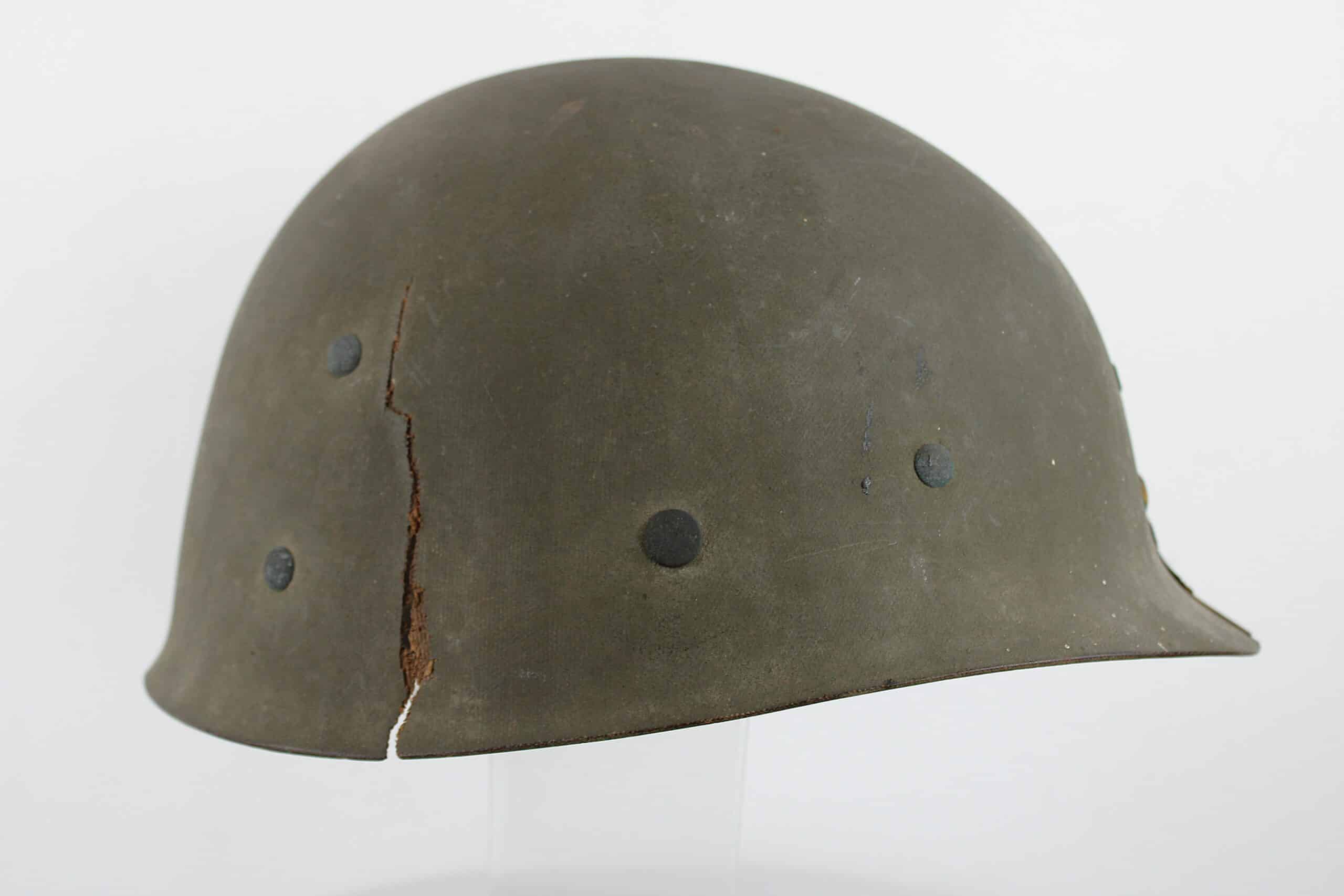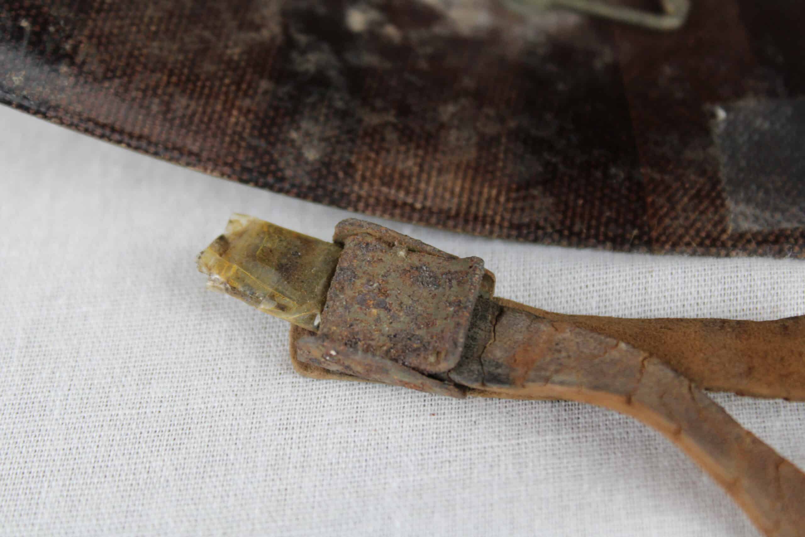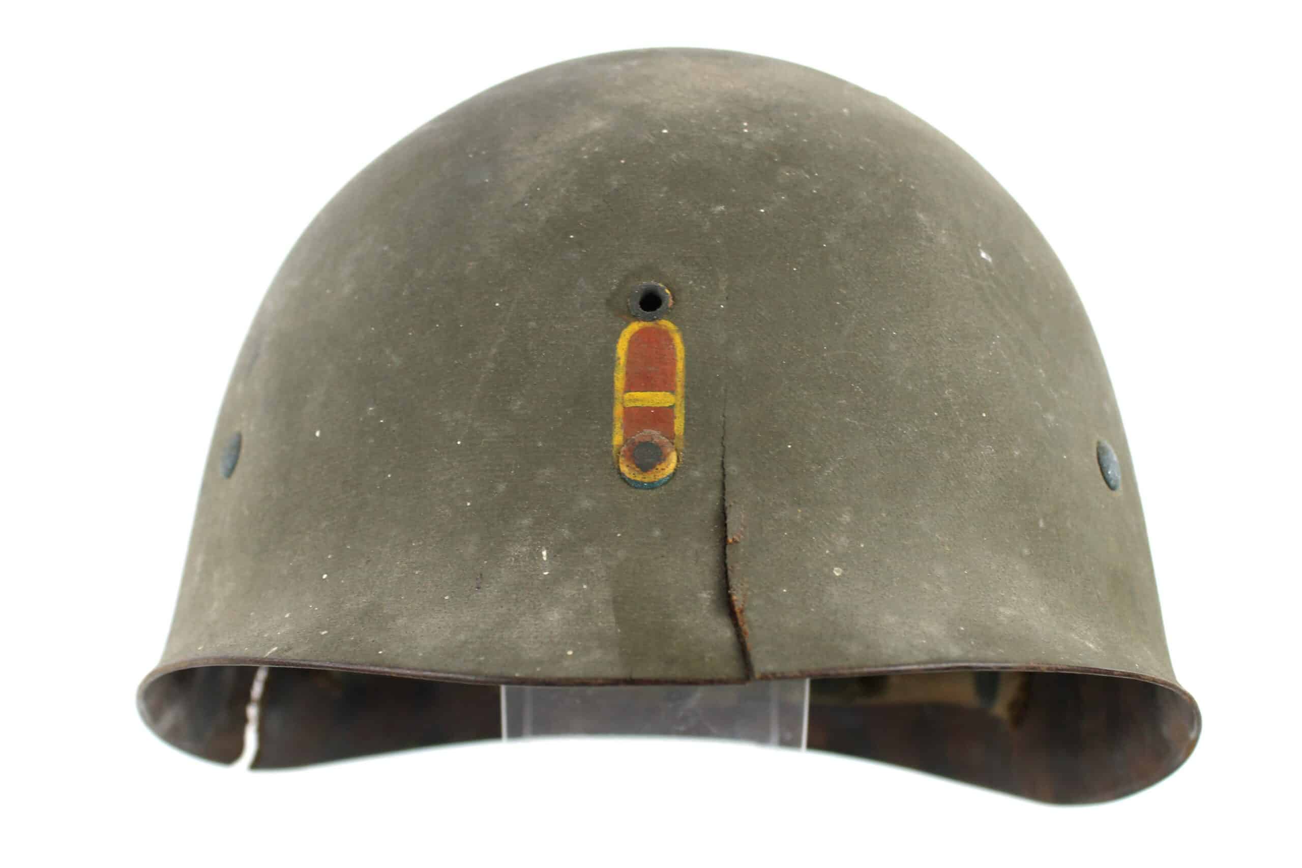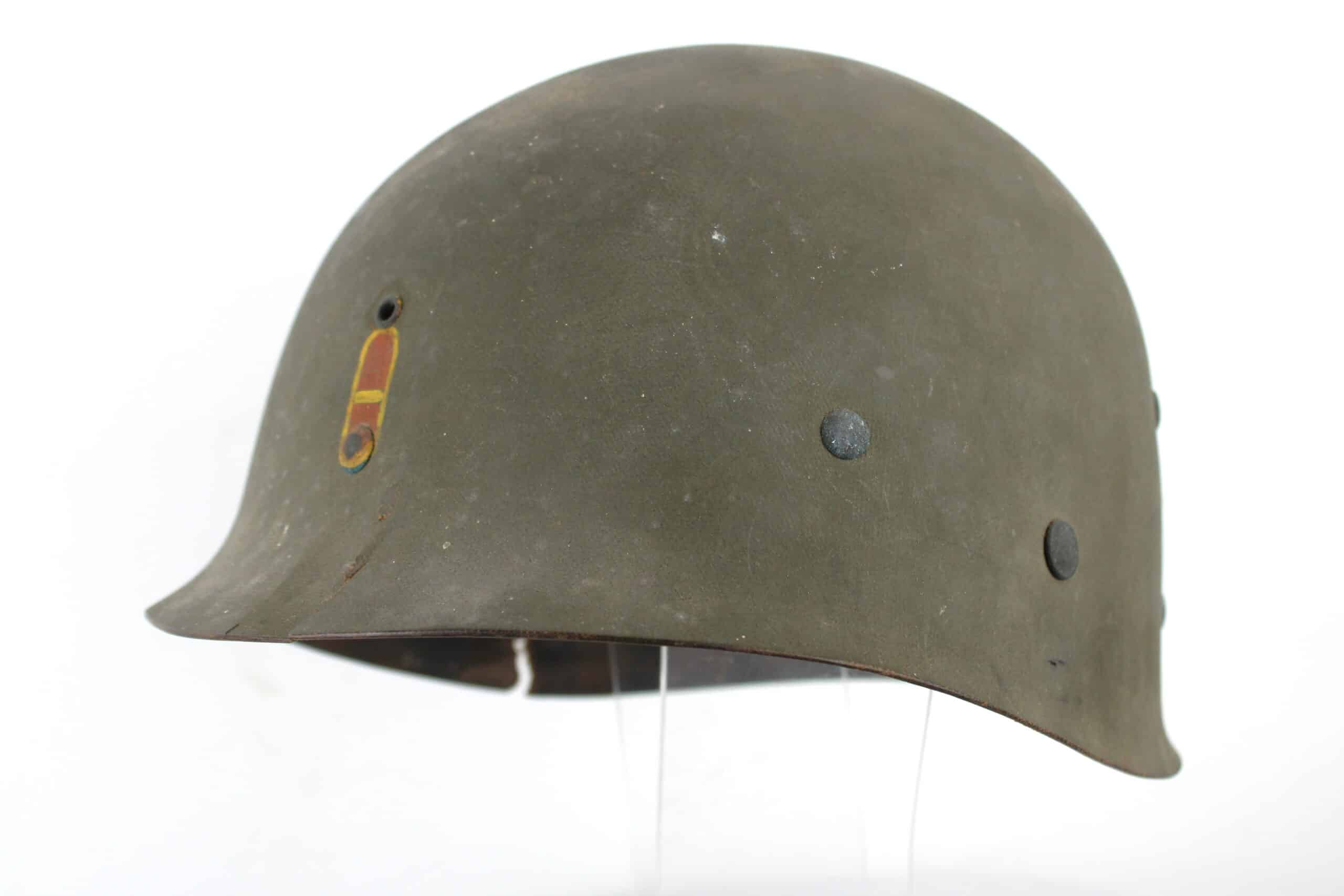 Peinture extérieur OD quasi complète, insigne de Warrant Officer Junior peint à l’avant, l’intérieur est plutôt complet et sans accident, A- frame en laiton noirci typique des fabrications tardives, Neckband réglable présente en toile OD7, Sweat band présente et bien montée d’origine avec clips peint en OD, la jugulaire tombe malheureusement en miette, à l’avant de la visière est visible le nom du porteur : DIEBOLT JAMES L W2205834.