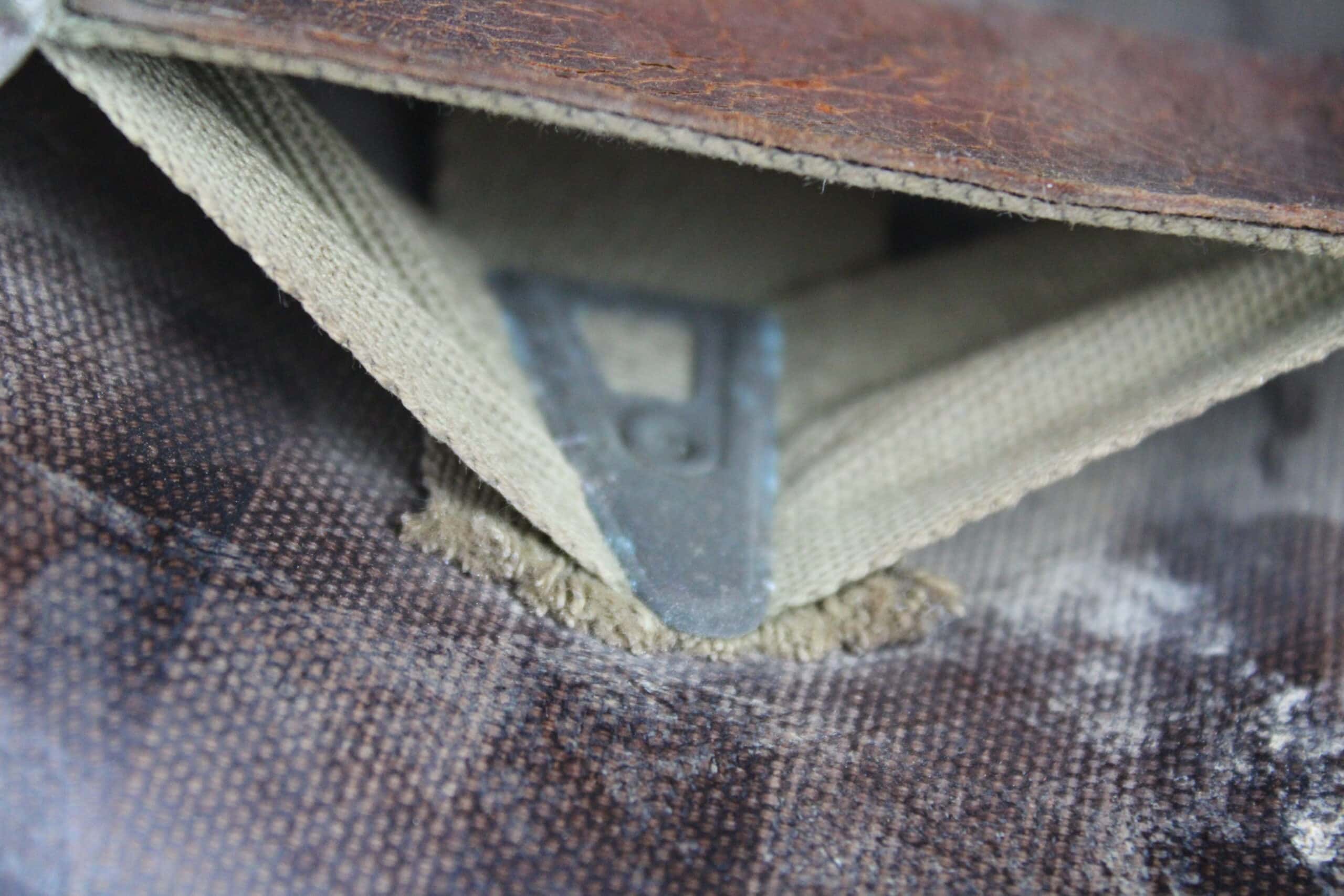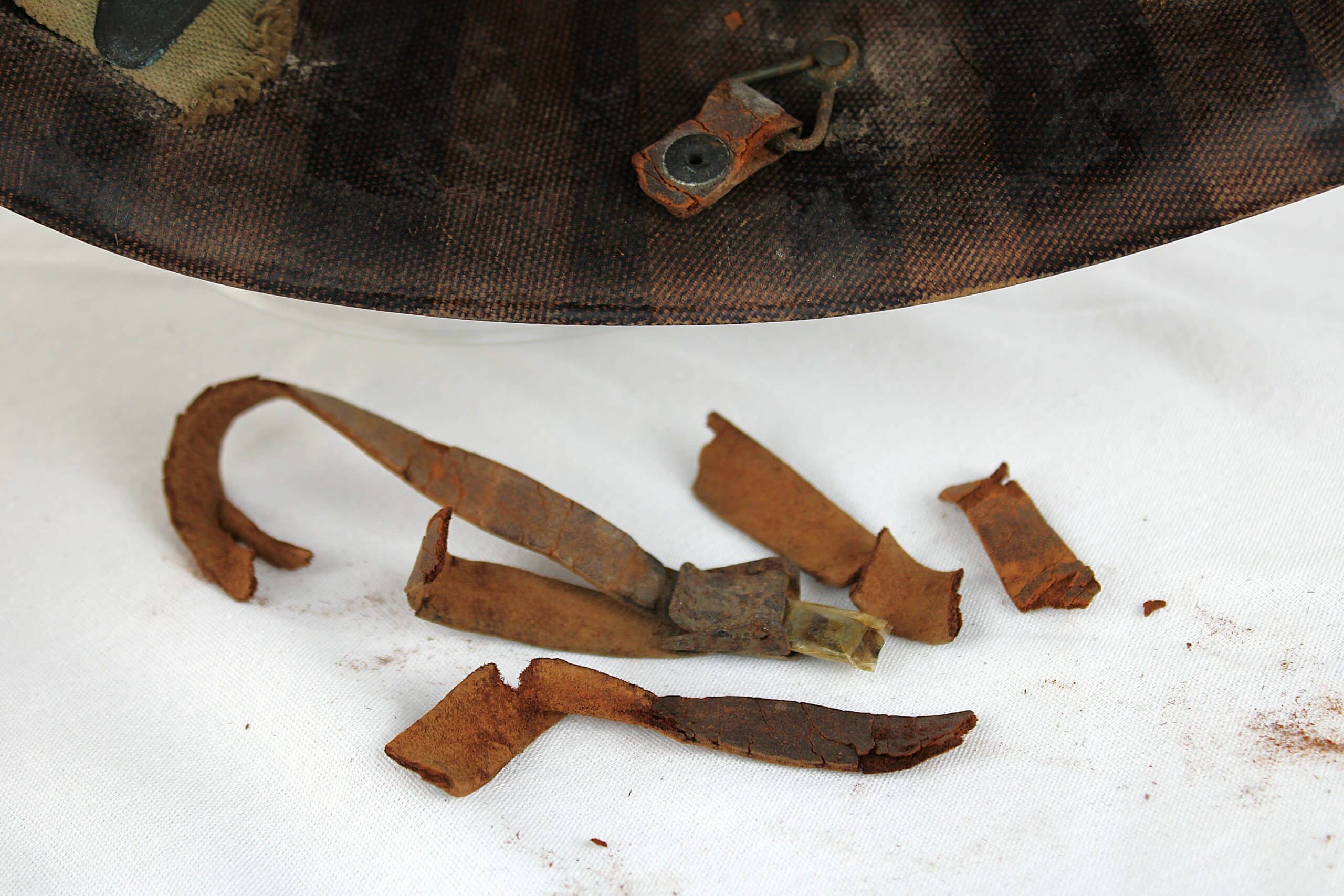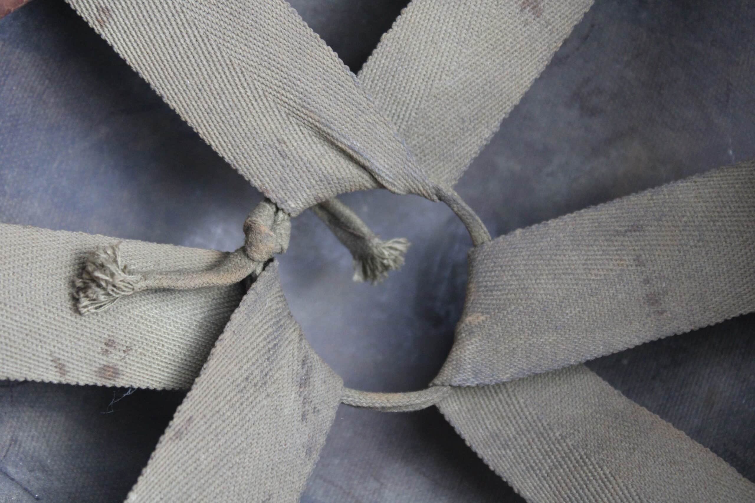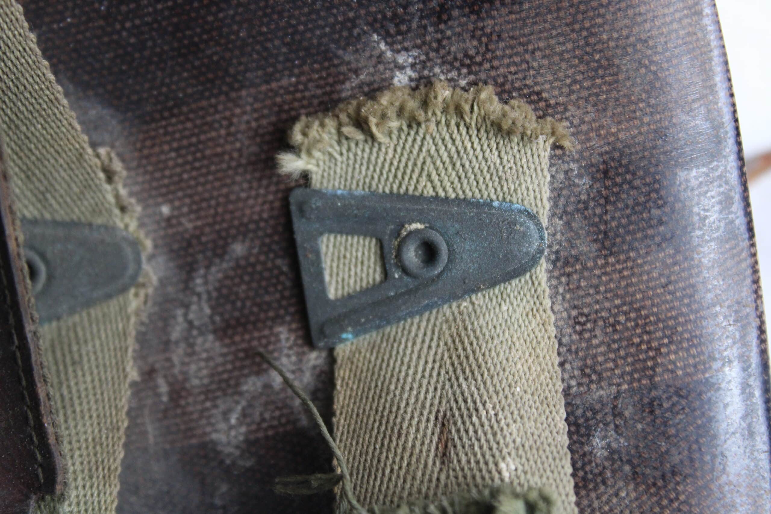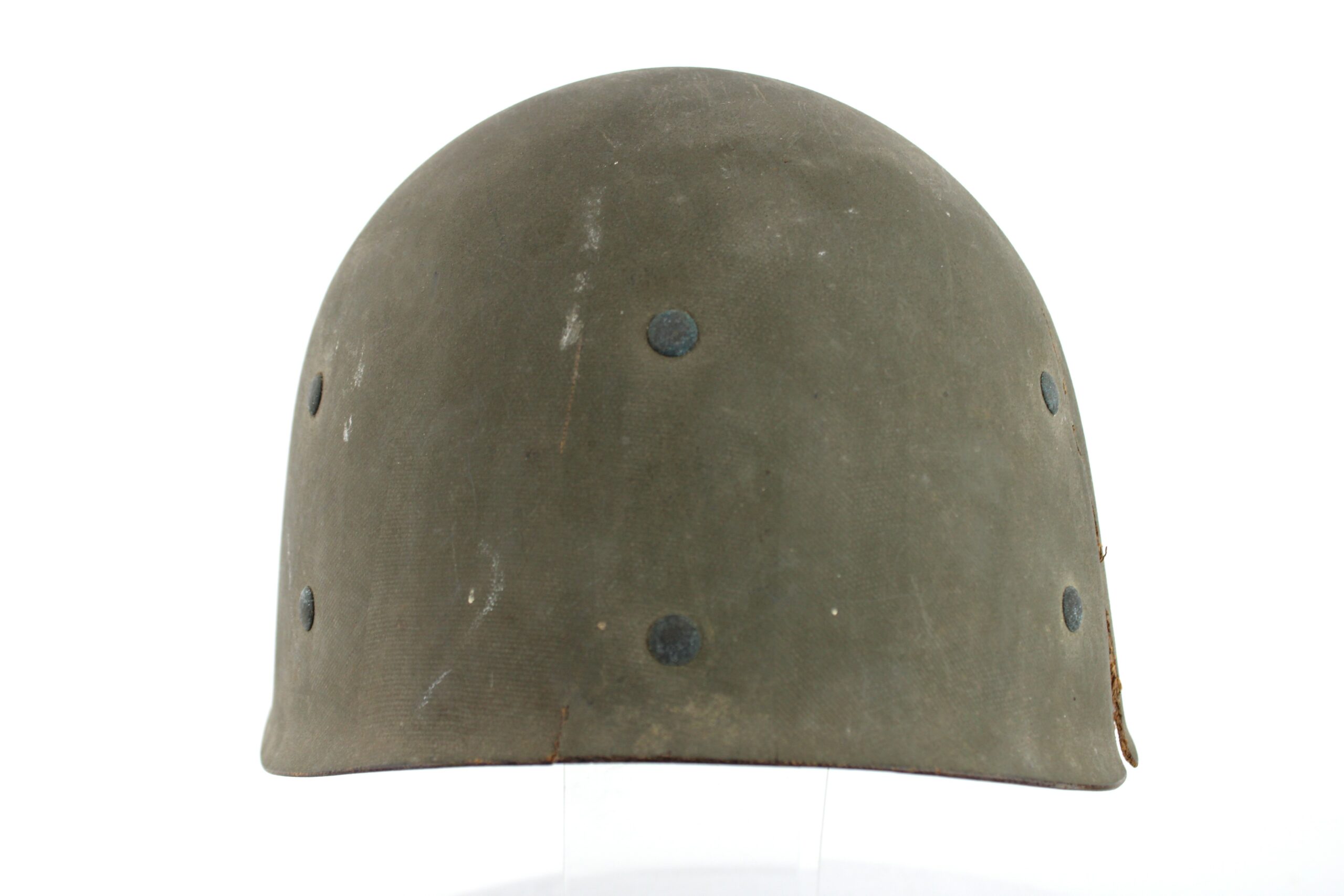 Peinture extérieur OD quasi complète, insigne de Warrant Officer Junior peint à l’avant, l’intérieur est plutôt complet et sans accident, A- frame en laiton noirci typique des fabrications tardives, Neckband réglable présente en toile OD7, Sweat band présente et bien montée d’origine avec clips peint en OD, la jugulaire tombe malheureusement en miette, à l’avant de la visière est visible le nom du porteur : DIEBOLT JAMES L W2205834.