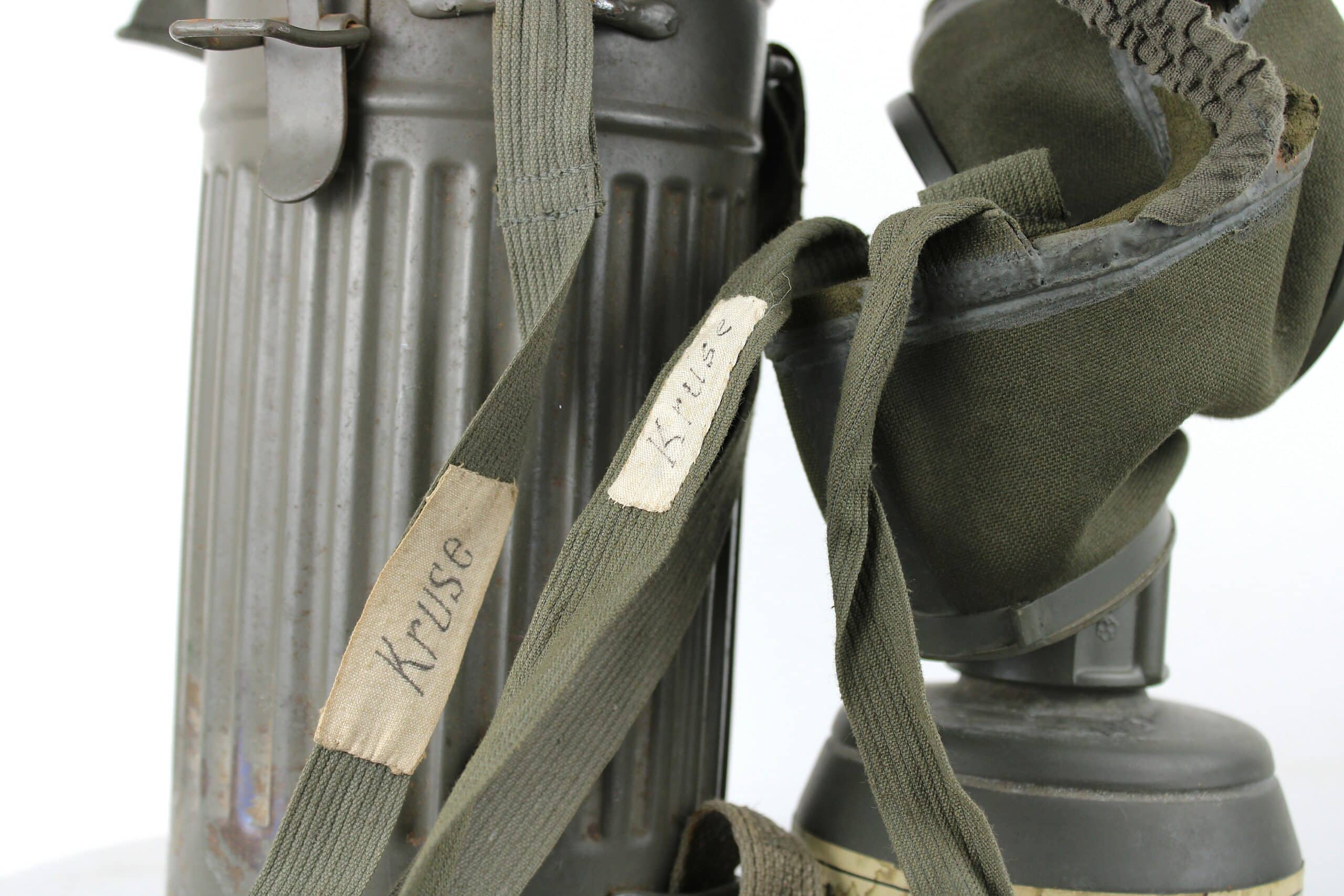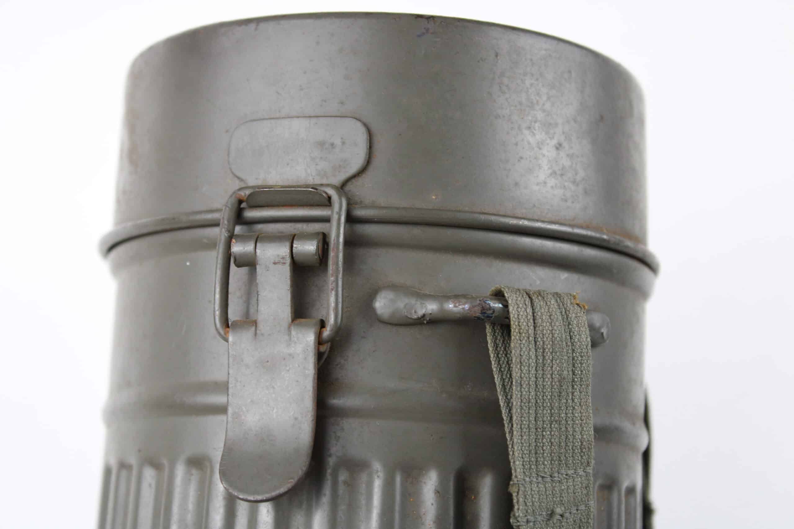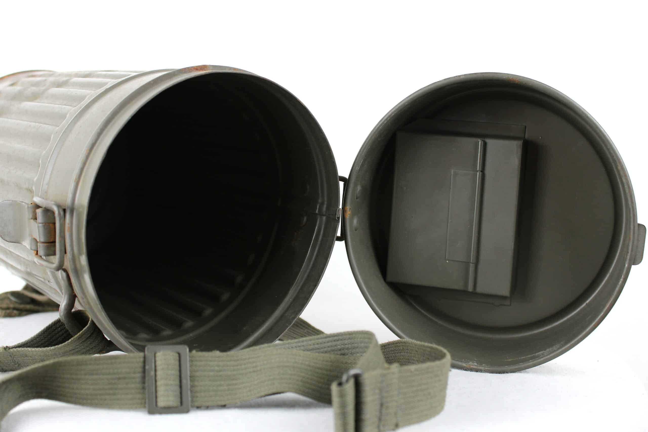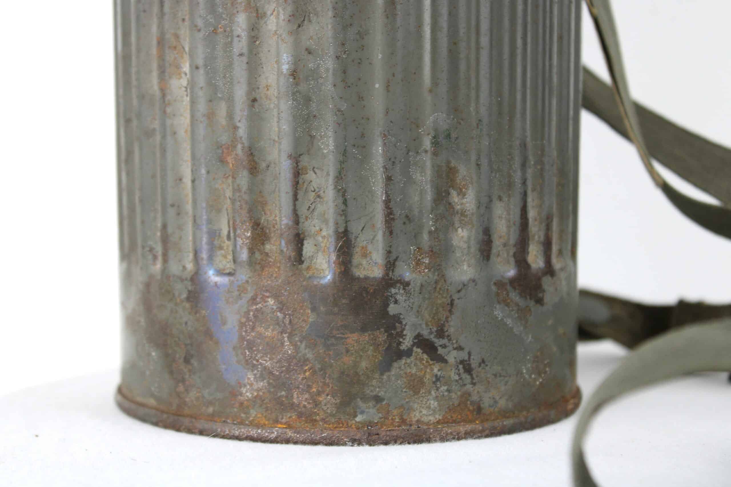 Boitier typique avec fermeture à levier, sangle longue cousue d’origine, sangle courte avec crochet bien présente et en parfait état. Le masque est un modèle combat de la heer de taille 2, bien marqué et daté de 1938 avec ses WaffenAmt; dans son rabat frontal se trouve un tampon de réception de la Luftschutz. La cartouche est dans un état similaire avec son papier encore présent dans son intégralité.