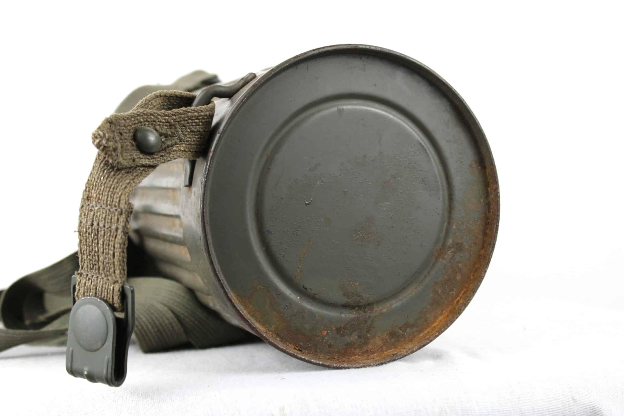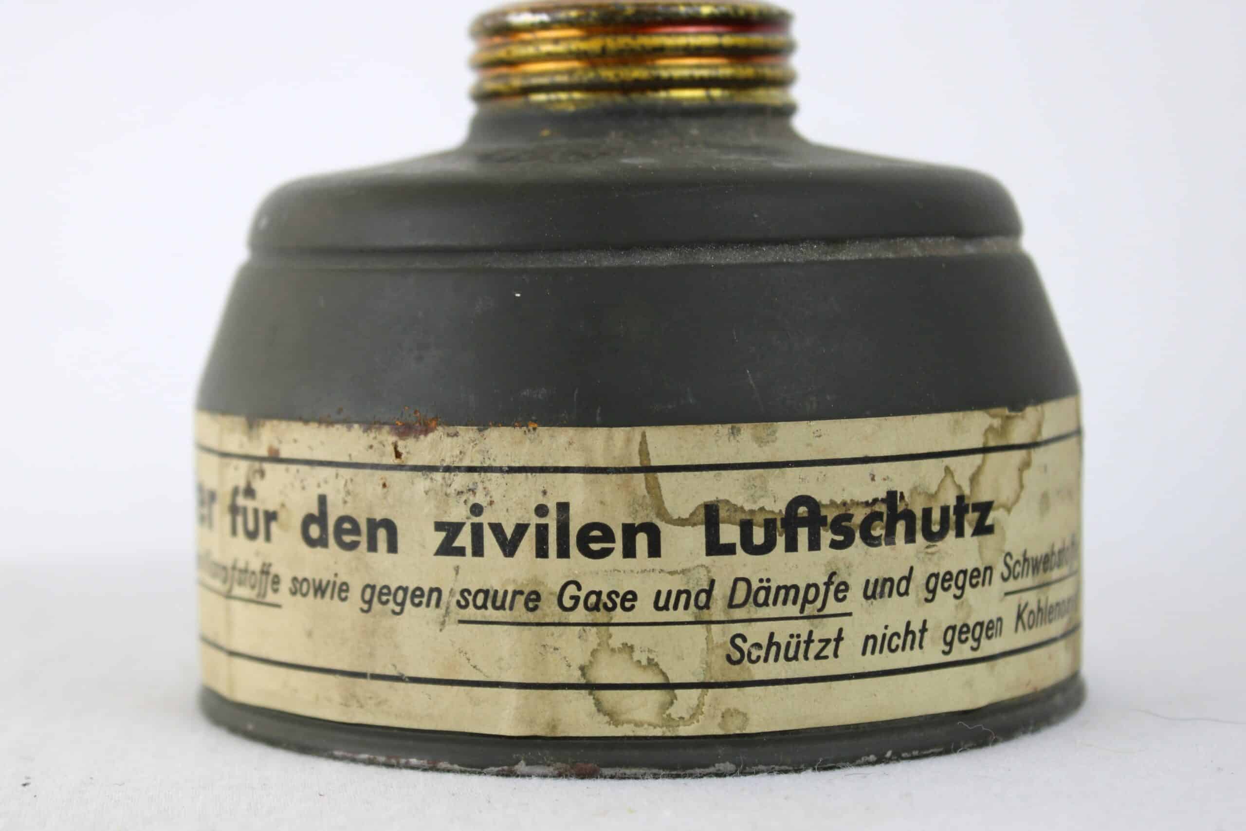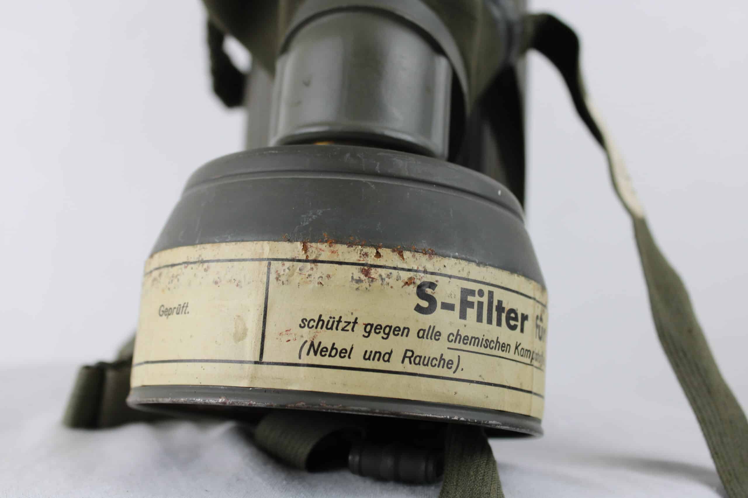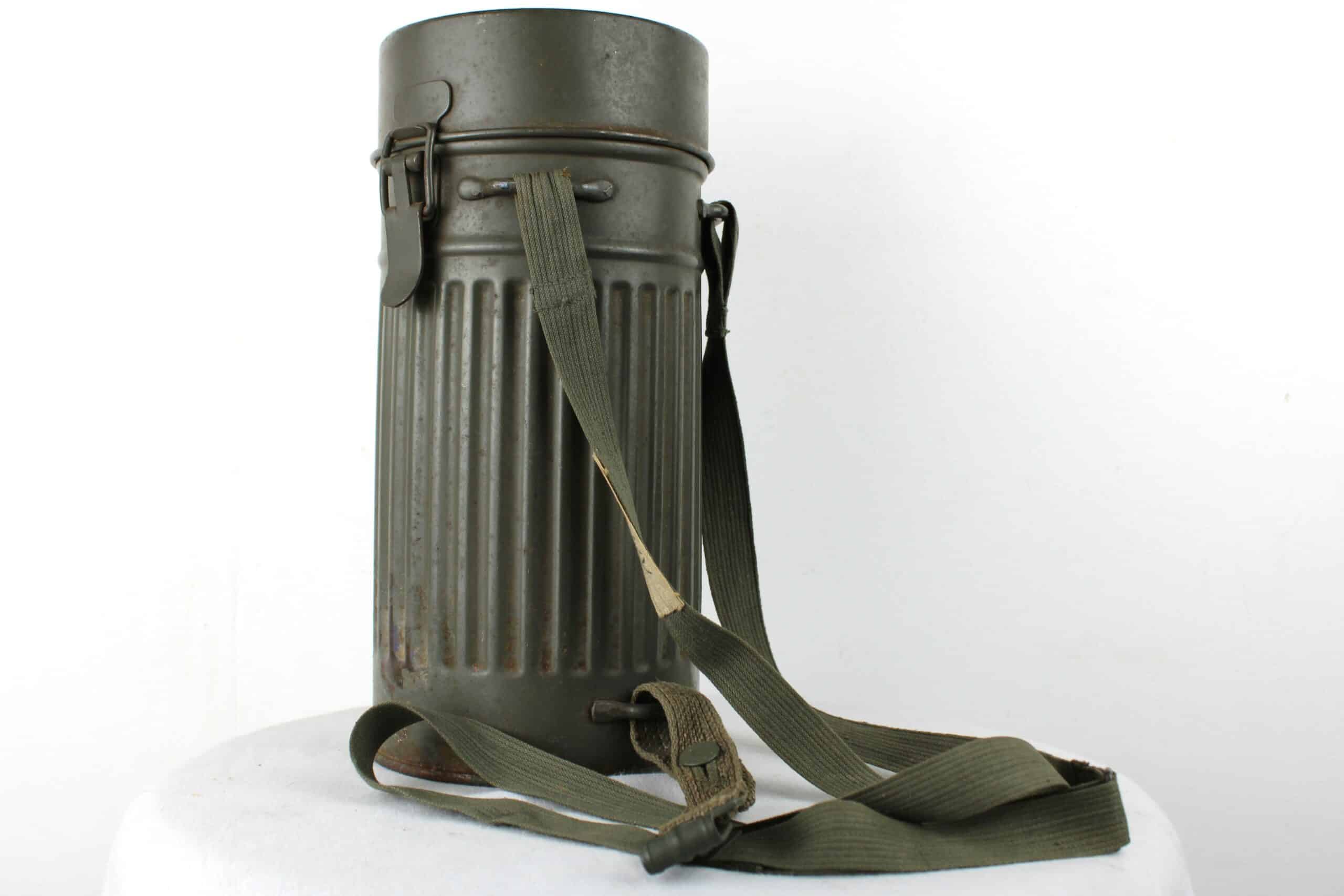 Boitier typique avec fermeture à levier, sangle longue cousue d’origine, sangle courte avec crochet bien présente et en parfait état. Le masque est un modèle combat de la heer de taille 2, bien marqué et daté de 1938 avec ses WaffenAmt; dans son rabat frontal se trouve un tampon de réception de la Luftschutz. La cartouche est dans un état similaire avec son papier encore présent dans son intégralité.