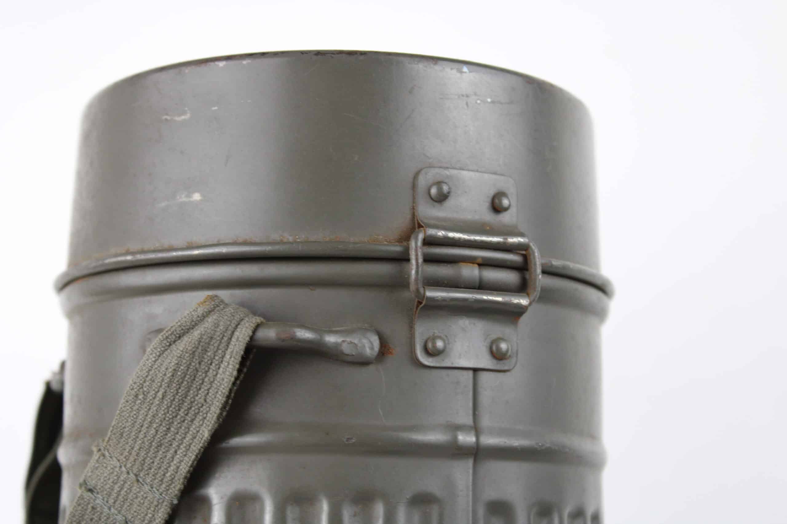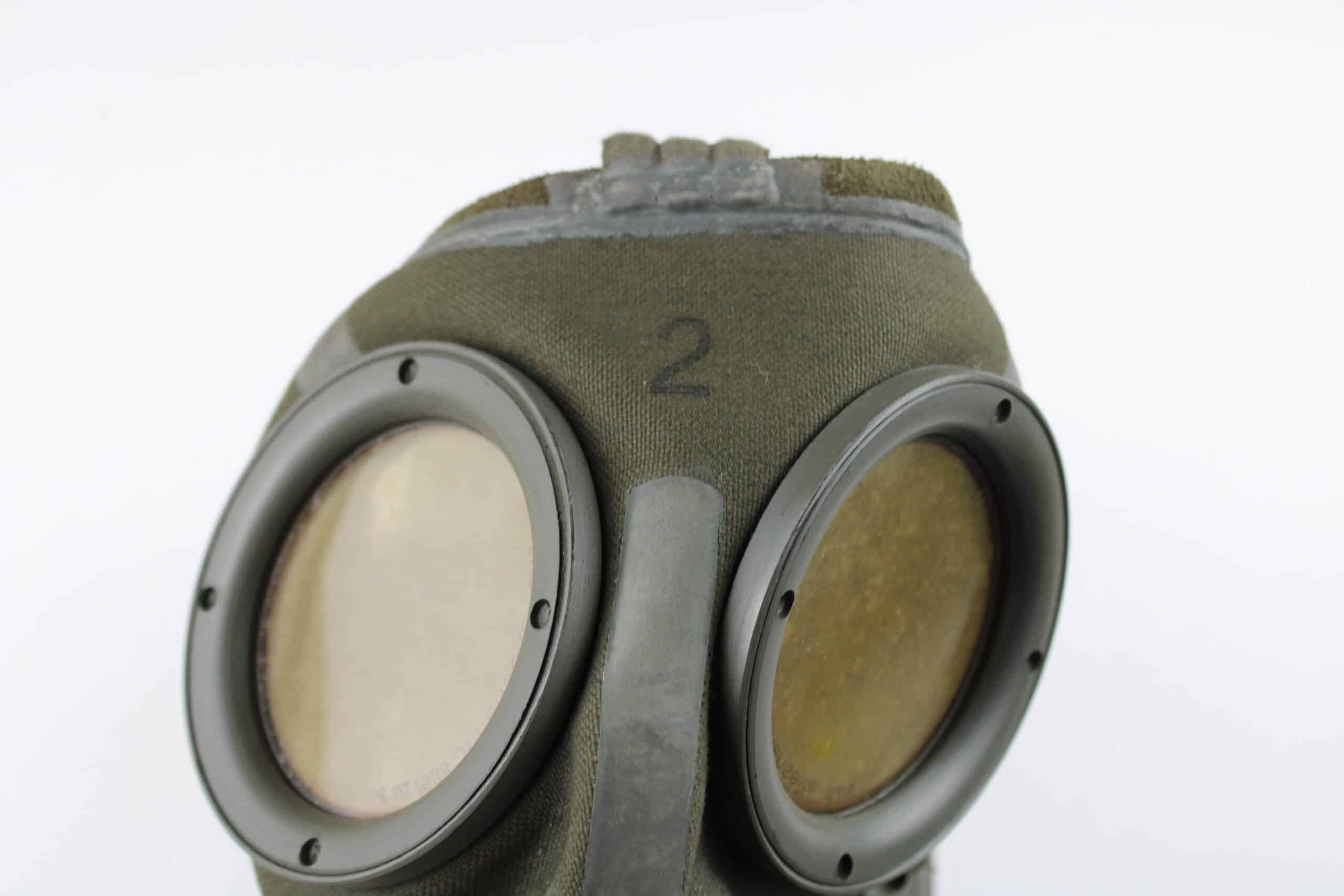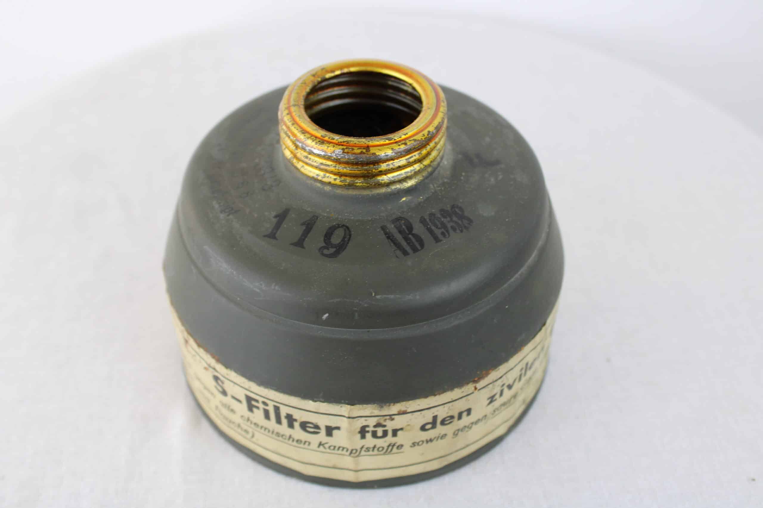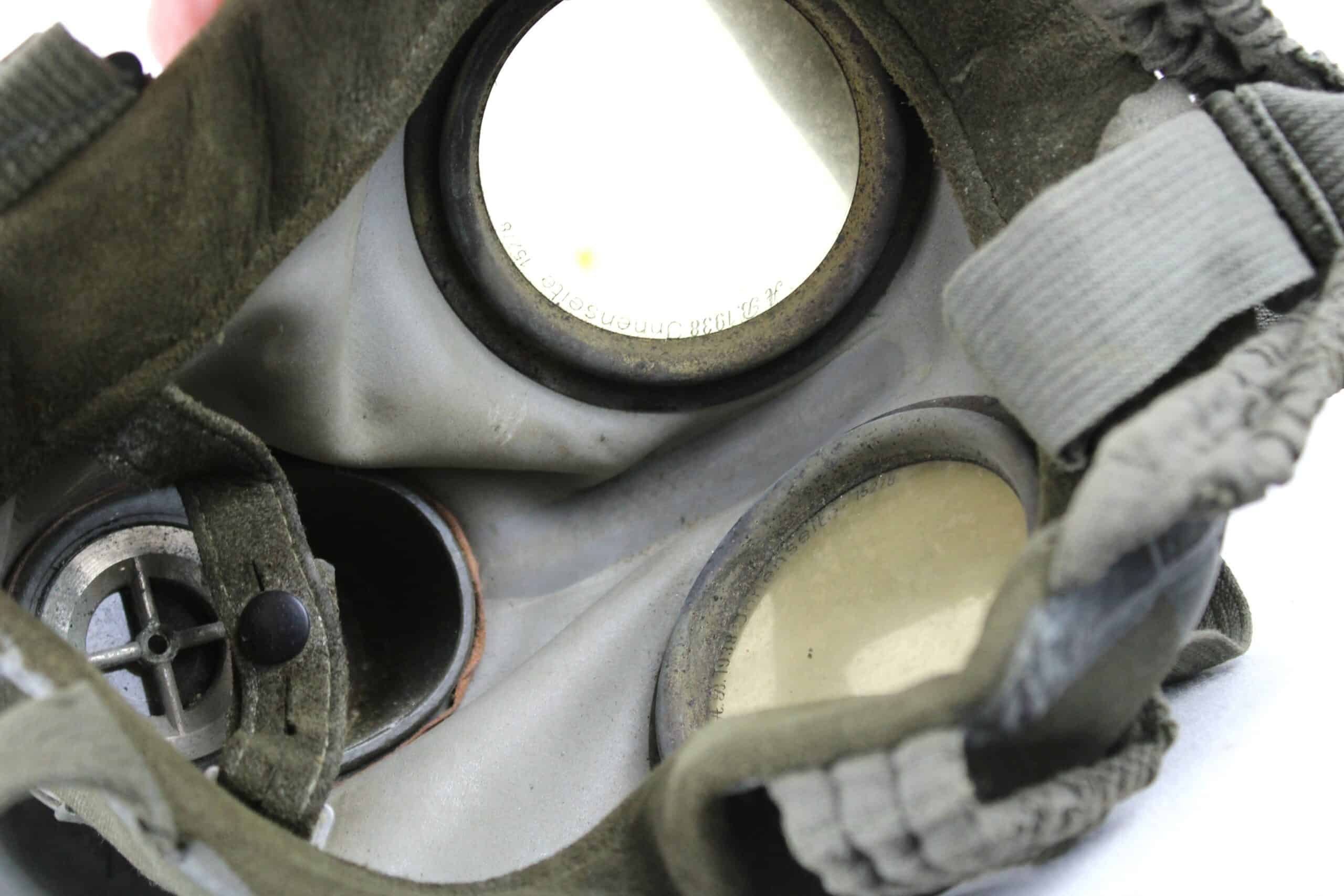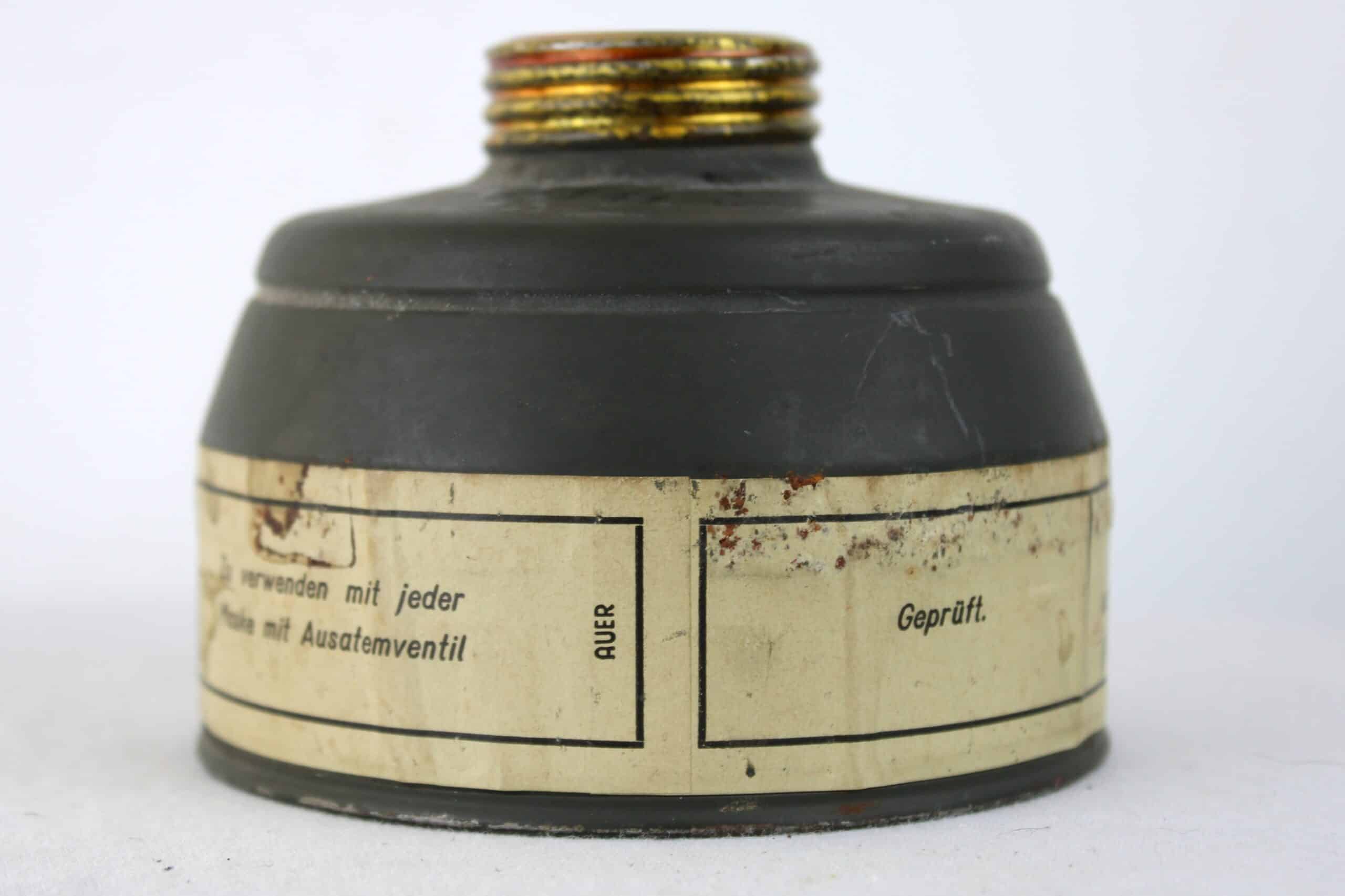 Boitier typique avec fermeture à levier, sangle longue cousue d’origine, sangle courte avec crochet bien présente et en parfait état. Le masque est un modèle combat de la heer de taille 2, bien marqué et daté de 1938 avec ses WaffenAmt; dans son rabat frontal se trouve un tampon de réception de la Luftschutz. La cartouche est dans un état similaire avec son papier encore présent dans son intégralité.