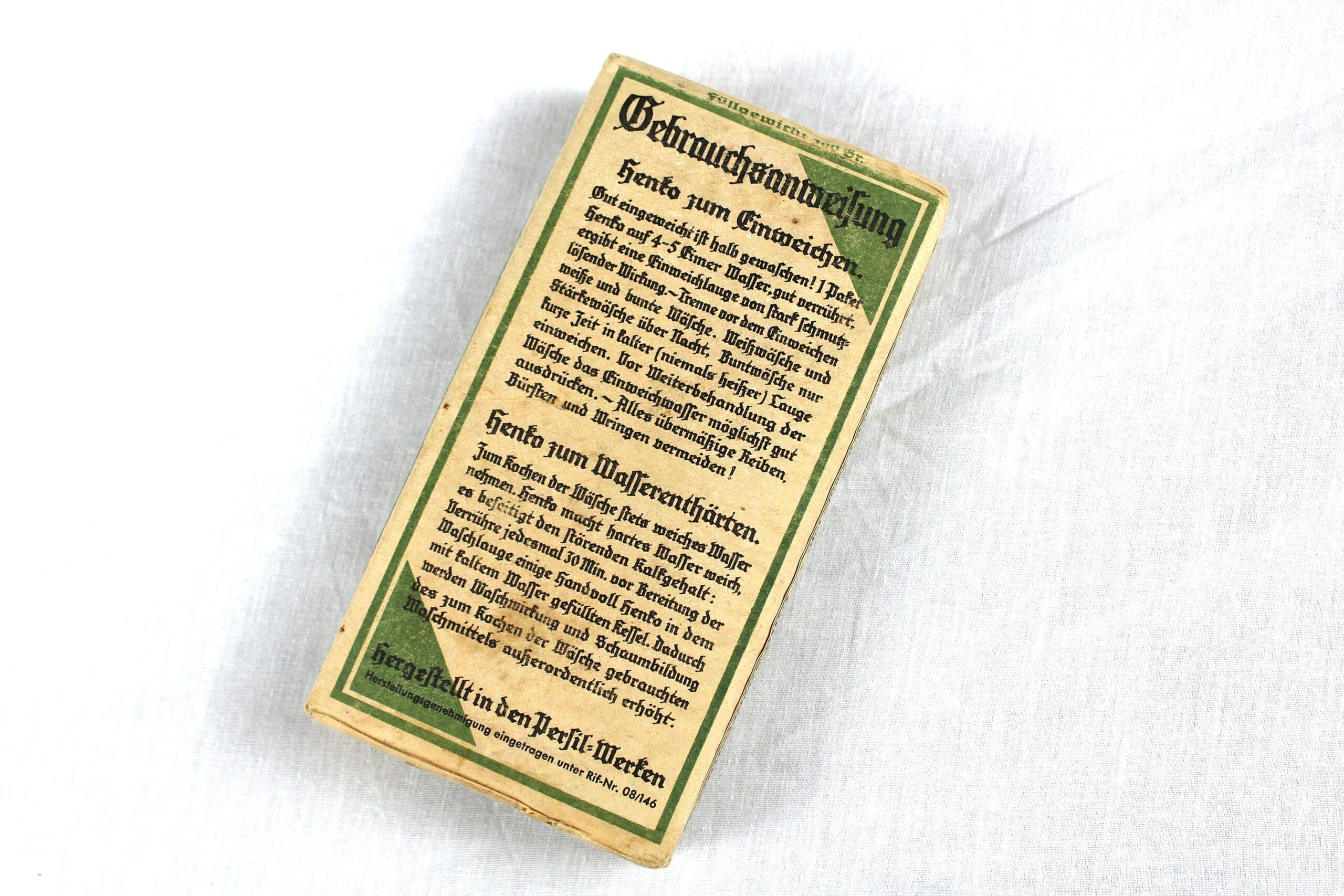 Paquet de lessive allemande « Henko » Paquet de lessive allemande "Henko" 30 € Catégories : ALLEMANDS Effets personnels AJOUTER AU PANIER Nos méthodes de paiement 100% sécurisés Paquet de lessive allemande « Henko » Paquet de lessive en parfait état et jamais ouvert. Un objet parfait pour remplir le sac à pain de votre landser ou en présentation dans une vitrine. Paquet de lessive allemande "Henko" Le produit a été ajouté avec succès